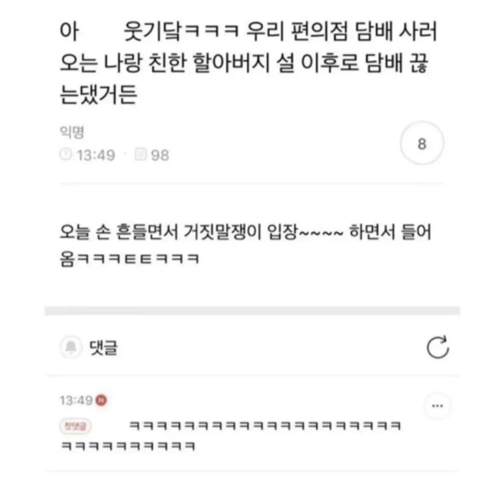 우리 편의점 단골 할아버지가 계시는데 작성자러바오|작성시간26.02.11|조회수28,365 목록 댓글 9 글자크기 작게가 글자크기 크게가 다음검색 현재 게시글 추가 기능 열기 북마크 공유하기 신고 센터로 신고 댓글 댓글 9 댓글쓰기 답글쓰기 댓글 리스트 작성자웰컴투주라식파크 | 작성시간 26.02.11 ㅋㅋㅋㅋㅋㅋㅋㅋㅋㅋㅋㅋㅋㅋ 작성자폴포그바 | 작성시간 26.02.11 귀여워 ㅋㅋㅋ 작성자현빈 | 작성시간 26.02.11 귀여우심ㅋㅋㅋㅋㅋ 작성자고우림 | 작성시간 26.02.11 ㅋㅋㅋㅋㅋ 등장이요 작성자밀키스 | 작성시간 26.02.11 ㅋㅋㅋㅋㅋㅋㅋ 댓글 전체보기