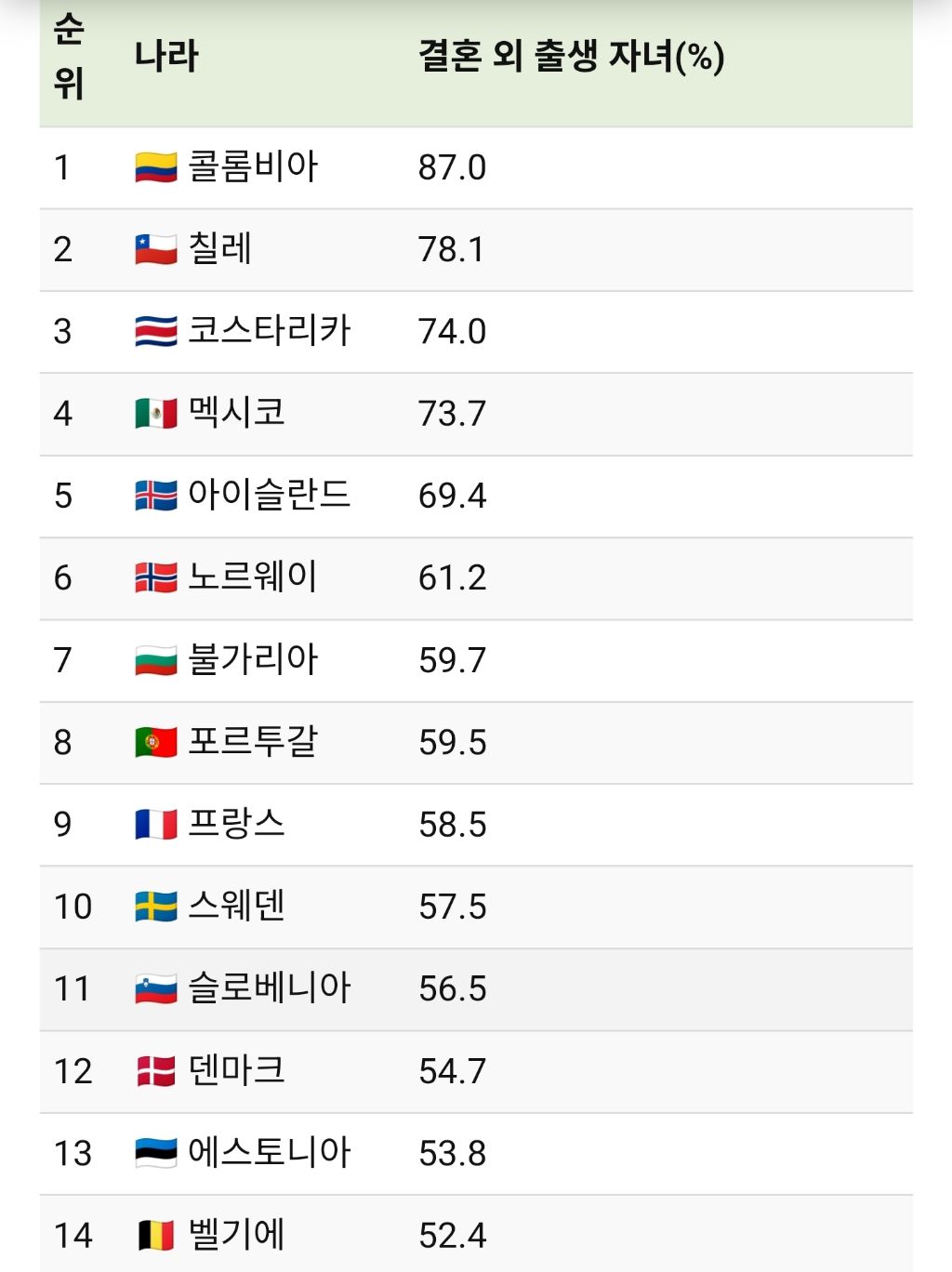 [정보]혼외출생아 비율 순위 작성자한교동|작성시간26.02.11|조회수4,854 목록 댓글 4 글자크기 작게가 글자크기 크게가 https://www.visualcapitalist.com/ranking-countries-babies-born-outside-marriage/Ranked: Countries by the Share of Babies Born Outside of MarriageWe rank countries based on the share of babies born outside of marriage, a vast range from Japan (2.4%) to Colombia (87%).www.visualcapitalist.com 다음검색 현재 게시글 추가 기능 열기 북마크 공유하기 신고 센터로 신고 댓글 댓글 4 댓글쓰기 답글쓰기 댓글 리스트 작성자奇誠庸 | 작성시간 26.02.11 중남미 머선 일 ㄷㄷ 작성자난누군가또여긴어딘가. | 작성시간 26.02.11 남미쪽은 결혼은 안하고 그냥 동거해서 사는건가 작성자소소비2 | 작성시간 26.02.11 저동네는 정식으로 결혼하면 손해보나 작성자No11네드베드 | 작성시간 26.02.11 친권이라는 개념이 우리나라랑 다른가....혼외자면 아빠가 애기랑 병원도 단둘이 못가는데 댓글 전체보기