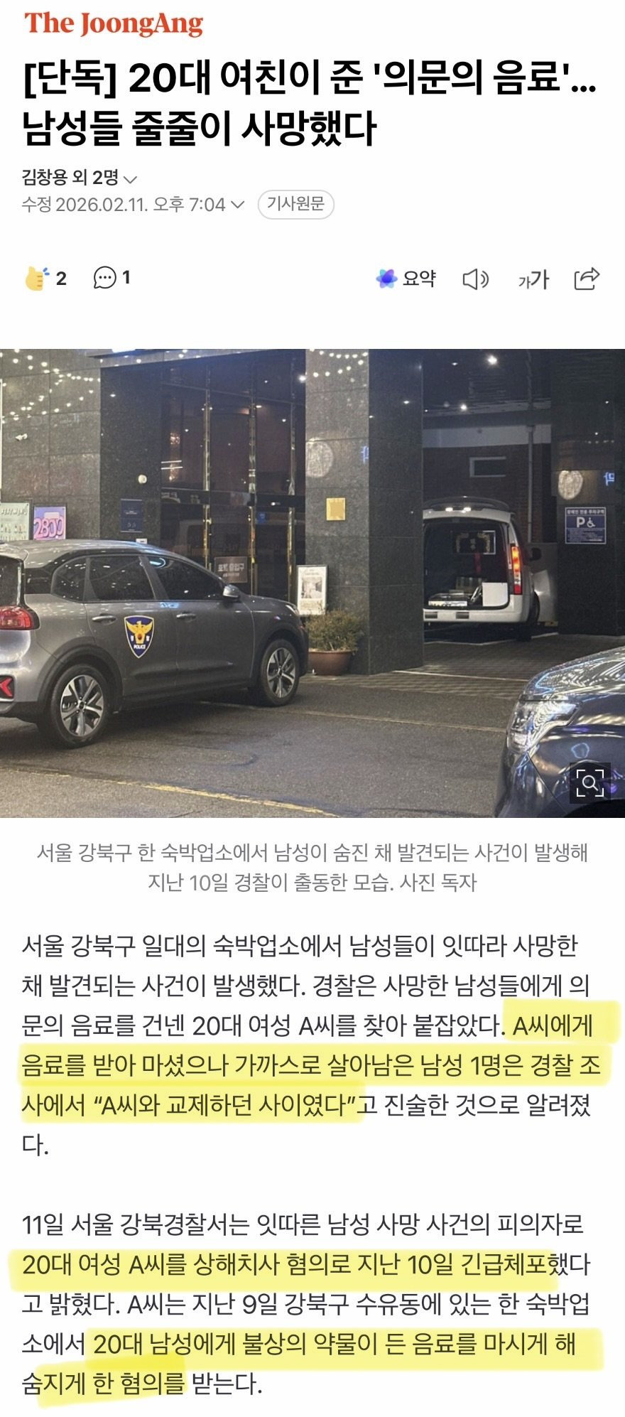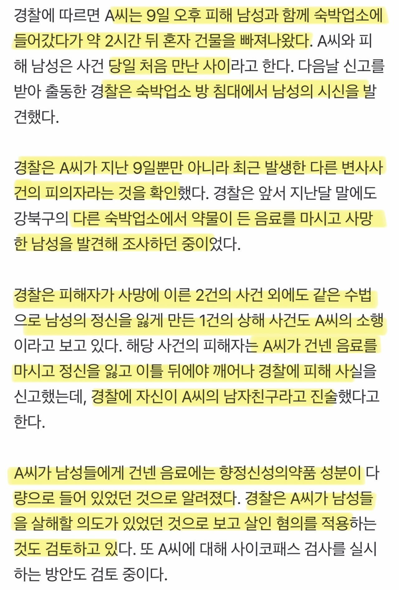 [기사][단독] 20대 여친이 준 '의문의 음료'…남성들 줄줄이 사망했다 작성자음교수|작성시간26.02.11|조회수12,161 목록 댓글 20 글자크기 작게가 글자크기 크게가 https://n.news.naver.com/article/025/0003502707[단독] 20대 여친이 준 '의문의 음료'…남성들 줄줄이 사망했다서울 강북구 일대의 숙박업소에서 남성들이 잇따라 사망한 채 발견되는 사건이 발생했다. 경찰은 사망한 남성들에게 의문의 음료를 건넨 20대 여성 A씨를 찾아 붙잡았다. A씨에게 음료를 받아 마n.news.naver.com 다음검색 현재 게시글 추가 기능 열기 북마크 공유하기 신고 센터로 신고 댓글 댓글 20 댓글쓰기 답글쓰기 댓글 리스트 작성자그래도아직은탱구 | 작성시간 26.02.11 ㄷㄷㄷ 작성자포메찡 | 작성시간 26.02.11 저게 청산가리 비슷한 작용을 하는건가향정신성의약품이라 적어놓으니정신관련 약품으로 이해 되네약물에 대해 모르니 작성자오다기리 죠 | 작성시간 26.02.12 ㄷㄷㄷ 작성자llliiiliilii | 작성시간 26.02.12 다음 인기글에 있는관련기사 여초 댓글 미친듯 작성자허니버터고구마 | 작성시간 26.02.12 소페인가; 댓글 전체보기