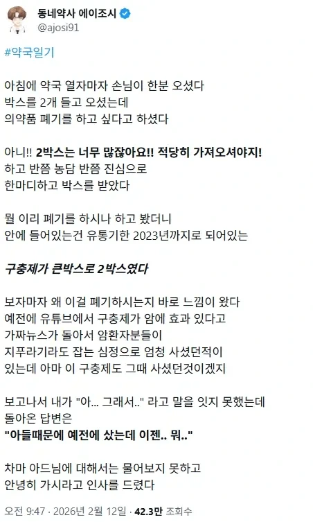 [기타]약사 버튜버가 말하는 안타까운 사연 작성자음교수|작성시간26.02.12|조회수15,452 목록 댓글 10 글자크기 작게가 글자크기 크게가 다음검색 현재 게시글 추가 기능 열기 북마크 공유하기 신고 센터로 신고 댓글 댓글 10 댓글쓰기 답글쓰기 댓글 리스트 작성자구구 | 작성시간 26.02.12 ㅠㅠ.. 작성자SOWON | 작성시간 26.02.12 ㅠㅠ 작성자트렌트 알렉산더 아놀드66 | 작성시간 26.02.12 ㅠㅠ 작성자Tensegrity Universe and Philosophy | 작성시간 26.02.12 ㅠㅠㅠㅠ 작성자I.B.I LUV | 작성시간 26.02.13 아.....ㅠㅠ 댓글 전체보기