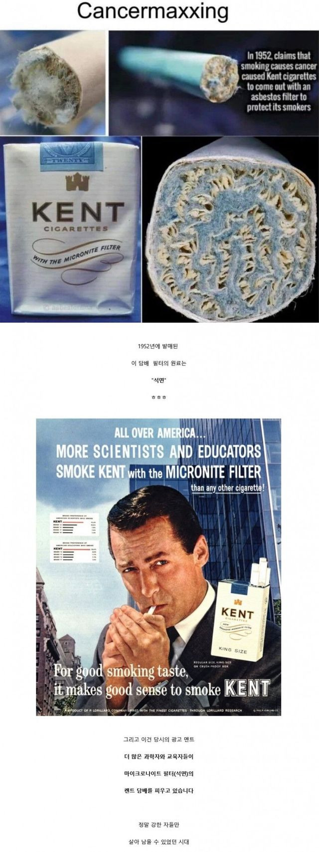 1952년 발매된 담배 필터의 원료 작성자헬스엔젤스|작성시간26.02.15|조회수4,430 목록 댓글 2 글자크기 작게가 글자크기 크게가 다음검색 현재 게시글 추가 기능 열기 북마크 공유하기 신고 센터로 신고 댓글 댓글 2 댓글쓰기 답글쓰기 댓글 리스트 작성자I’d rather be ashes than dust | 작성시간 26.02.15 석면 ㄷㄷㄷ 작성자奇誠庸 | 작성시간 26.02.15 세상에 ㄷㄷㄷㄷㄷㄷㄷ 댓글 전체보기