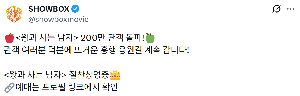 [영화]'왕과 사는 남자' 200만 관객 돌파 작성자서스날|작성시간26.02.15|조회수5,205 목록 댓글 19 글자크기 작게가 글자크기 크게가 개봉 12일차 다음검색 현재 게시글 추가 기능 열기 북마크 공유하기 신고 센터로 신고 댓글 댓글 19 댓글쓰기 답글쓰기 댓글 리스트 작성자Birdwoo | 작성시간 26.02.15 처음부터 끝까지 너무 좋았음. 와이프도 보다가 오열 ㅎㅎ 작성자한화 이글스 | 작성시간 26.02.15 장항준은 비호감이긴한데 고민되네 작성자I’d rather be ashes than dust | 작성시간 26.02.15 이준혁도 나오는구나 작성자하빵 | 작성시간 26.02.15 와 유지태 글씨체 존멋이네 작성자Dennis Cirkin | 작성시간 26.02.15 딱 500만만 가자 고고우 댓글 전체보기