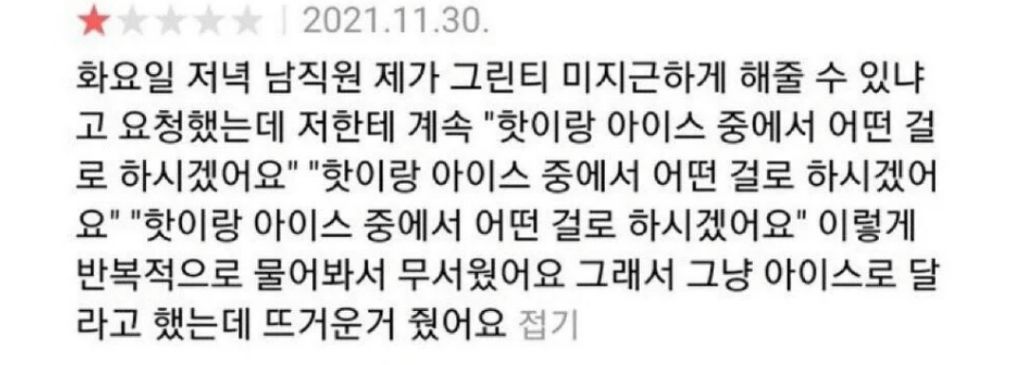 카페 리뷰 별점 1점 준 이유 작성자러바오|작성시간26.02.15|조회수6,773 목록 댓글 1 글자크기 작게가 글자크기 크게가 다음검색 현재 게시글 추가 기능 열기 북마크 공유하기 신고 센터로 신고 댓글 댓글 1 댓글쓰기 답글쓰기 댓글 리스트 작성자주ㅕ니애비 | 작성시간 26.02.15 ㅋㅋㅋㅋㅋㅋㅋㅋㅋ 인정해야지 저건.... 댓글 전체보기