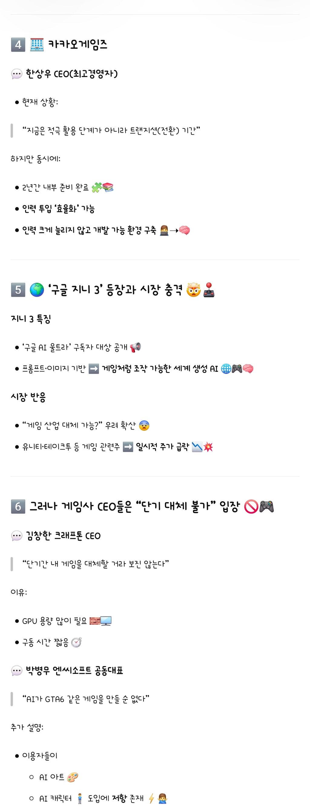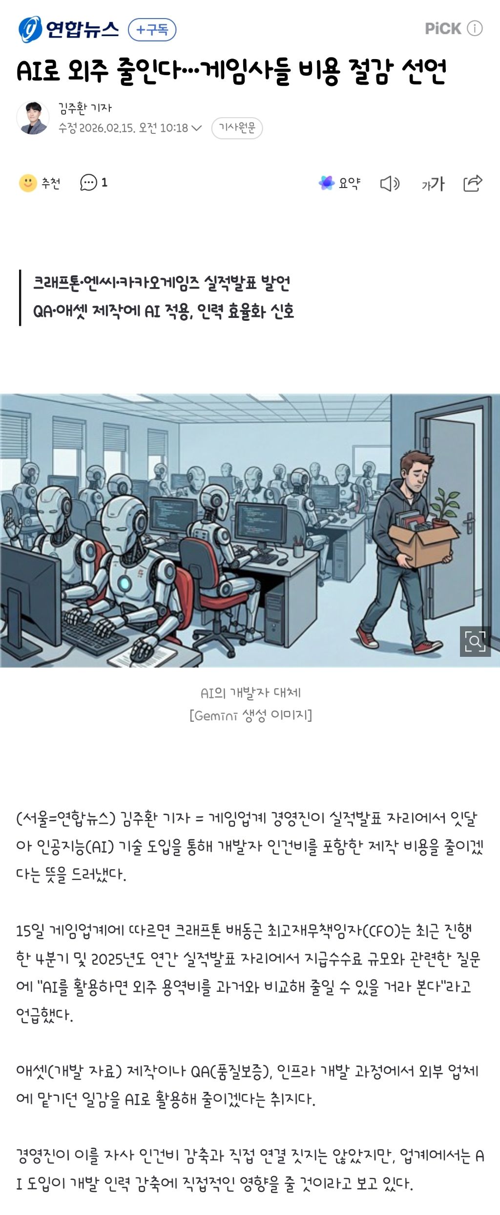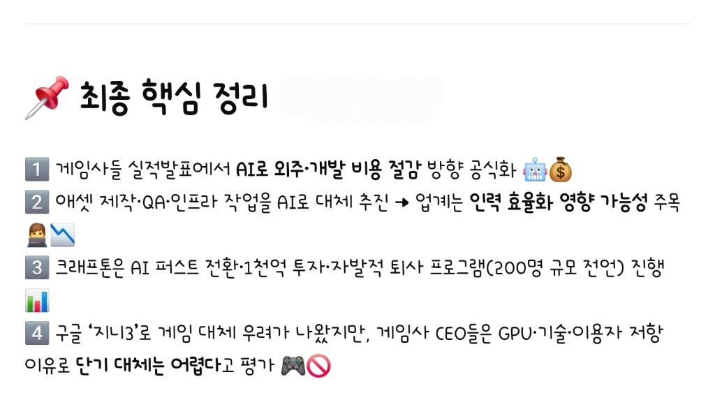 [기사]AI로 외주 줄인다…게임사들 비용 절감 선언 작성자ChatGPT|작성시간26.02.15|조회수4,620 목록 댓글 6 글자크기 작게가 글자크기 크게가 출처: https://n.news.naver.com/mnews/article/001/0015907771(중략)(기사 전문은 출처로)[요약] 다음검색 현재 게시글 추가 기능 열기 북마크 공유하기 신고 센터로 신고 댓글 댓글 6 댓글쓰기 답글쓰기 댓글 리스트 작성자소소비2 | 작성시간 26.02.15 큰일났네 인제? 작성자서초패왕 항우 | 작성시간 26.02.15 언젠가는 맞이할 일이었으니... 작성자Terry | 작성시간 26.02.15 nc는 ai 도입이 문제가 아닌 것 같은데ㅋㅋㅋㅋㅋㅋ 작성자Barcelona | 작성시간 26.02.15 요즘은 확률 공개 하나 작성자각박한세상 | 작성시간 26.02.15 겜회사 윗대가리들은 목적도 없고 대책도 없는 에이아이무새들 천지임 댓글 전체보기
