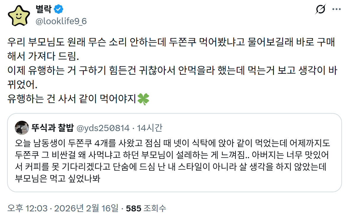 소금빵 말차 두쫀쿠 뭐 유행하면 다 사다주는데 취향아니라고 하심ㅋㅋㅋ근데 유행하는 거 먹어보는 것 자체를 신기해하고 웃으면서 좋아하심ㅋㅋ이게 그거냐고ㅋㅋㅋ
