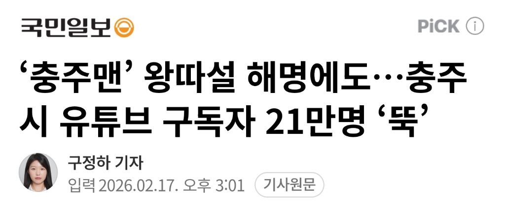 [기사]‘충주맨’ 왕따설 해명에도…충주시 유튜브 구독자 21만명 ‘뚝’.gisa 작성자강동구주민 3|작성시간26.02.17|조회수7,105 목록 댓글 11 글자크기 작게가 글자크기 크게가 ‘충주맨’ 왕따설 해명에도…충주시 유튜브 구독자 21만명 ‘뚝’‘충주맨’으로 알려진 김선태 충주시 주무관의 사직 소식이 알려진 뒤 충주시 공식 유튜브 채널 구독자가 대거 이탈하고 있다. 17일 오후 기준 충주시 공식 유튜브 ‘충주시’ 채널 구독자는 76n.news.naver.com 다음검색 현재 게시글 추가 기능 열기 북마크 공유하기 신고 센터로 신고 댓글 댓글 11 댓글쓰기 답글쓰기 댓글 리스트 작성자ㅅㅌㅍㅇㄷㅅㅌㅍ | 작성시간 26.02.17 지호가 간다 존잼인데ㅠ 답댓글 작성자미니언즈 | 작성시간 26.02.17 222 졸잼인데 답댓글 작성자예비군훈련질문받음 | 작성시간 26.02.17 333 지호야힘내 작성자Barcelona | 작성시간 26.02.17 채널 주인장이 바뀌는 거나 마찬가지라 빠지는 게 당연한 거 같은데 작성자즈믄가람 | 작성시간 26.02.17 결국 구독자들은 김선태 보려고 구독한 거지, 충주시에 관심이 생겨서 구독한 게 아니라는 뜻임 댓글 전체보기