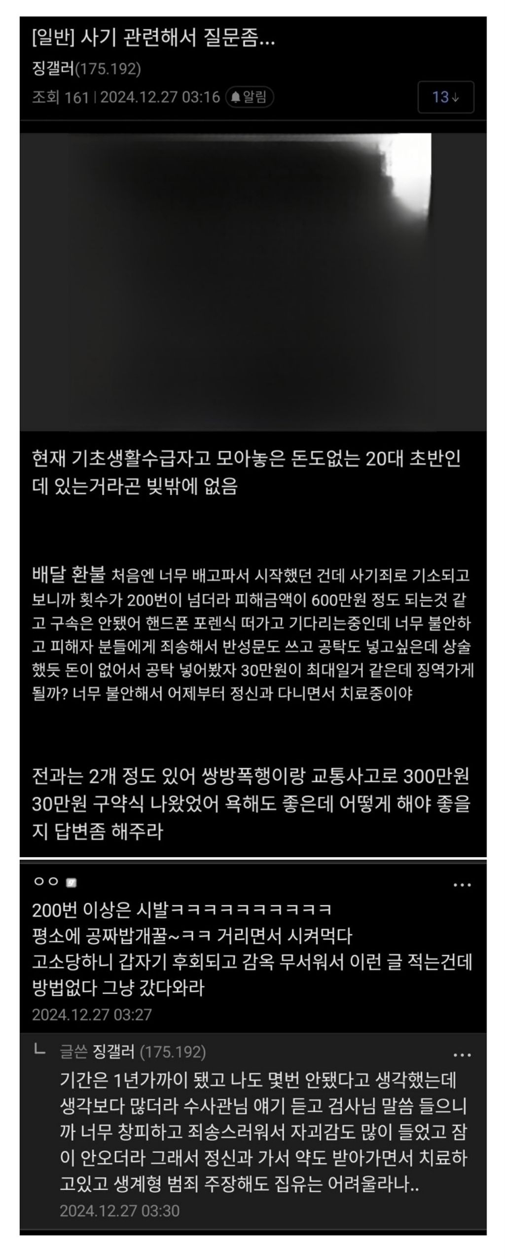 [기타]1년동안 배달환불 200번 하다 걸린 사람 작성자음교수|작성시간26.02.19|조회수13,863 목록 댓글 23 글자크기 작게가 글자크기 크게가 다음검색 현재 게시글 추가 기능 열기 북마크 공유하기 신고 센터로 신고 댓글 댓글 23 댓글쓰기 답글쓰기 댓글 리스트 작성자Google | 작성시간 26.02.19 플랫폼이 저걸 몰랐을까 작성자우감효 | 작성시간 26.02.19 머리가 멍청한짓 했으니몸이 고생해야지 뭐 작성자I.B.I LUV | 작성시간 26.02.19 그냥 갔다와 작성자서현진 | 작성시간 26.02.19 상습적인 배달 환불을 해놓고 징역 가는건 불안한가보네 작성자조손 | 작성시간 26.02.19 배달이 환불되요? 댓글 전체보기