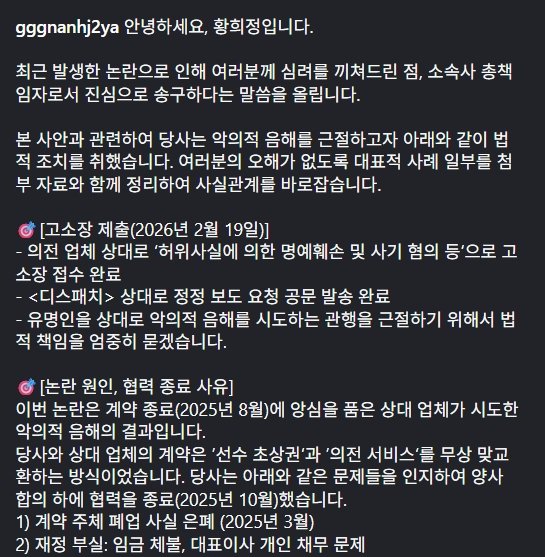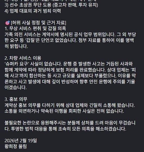 [SNS]황희찬 누나(황희정) 입장문 작성자Professor|작성시간26.02.19|조회수7,694 목록 댓글 3 글자크기 작게가 글자크기 크게가 다음검색 현재 게시글 추가 기능 열기 북마크 공유하기 신고 센터로 신고 댓글 댓글 3 댓글쓰기 답글쓰기 댓글 리스트 작성자행복해진다 | 작성시간 26.02.19 희찬도 희정도1년에 각각 10번 사고낸건 부정 안하는중 작성자요한 크루이프 | 작성시간 26.02.19 너무 길어서 못읽겠다 작성자노어이 | 작성시간 26.02.19 지금껏 아무말 않고 있었는데이로써 운전 못 하는 건 팩트.... 댓글 전체보기