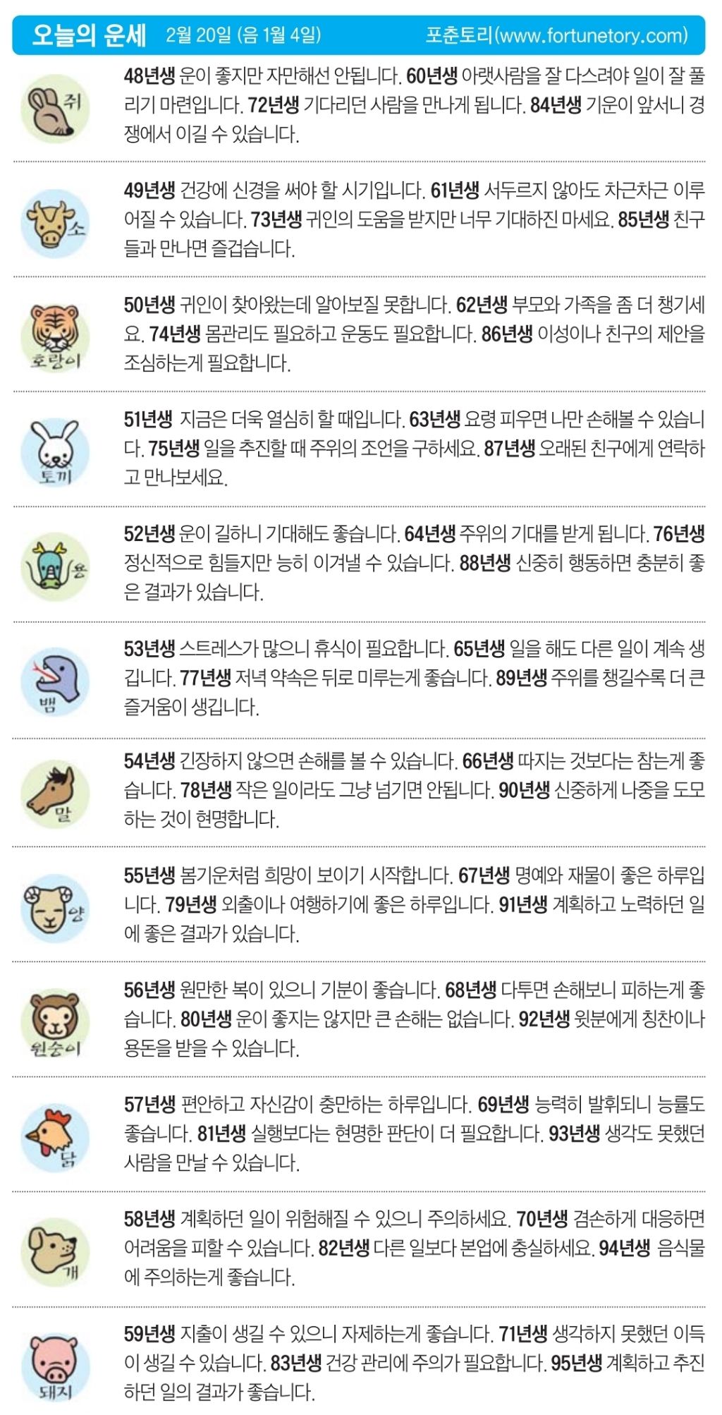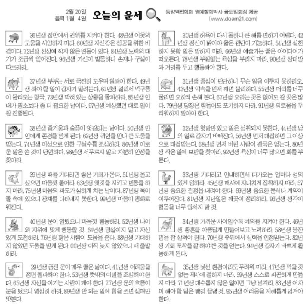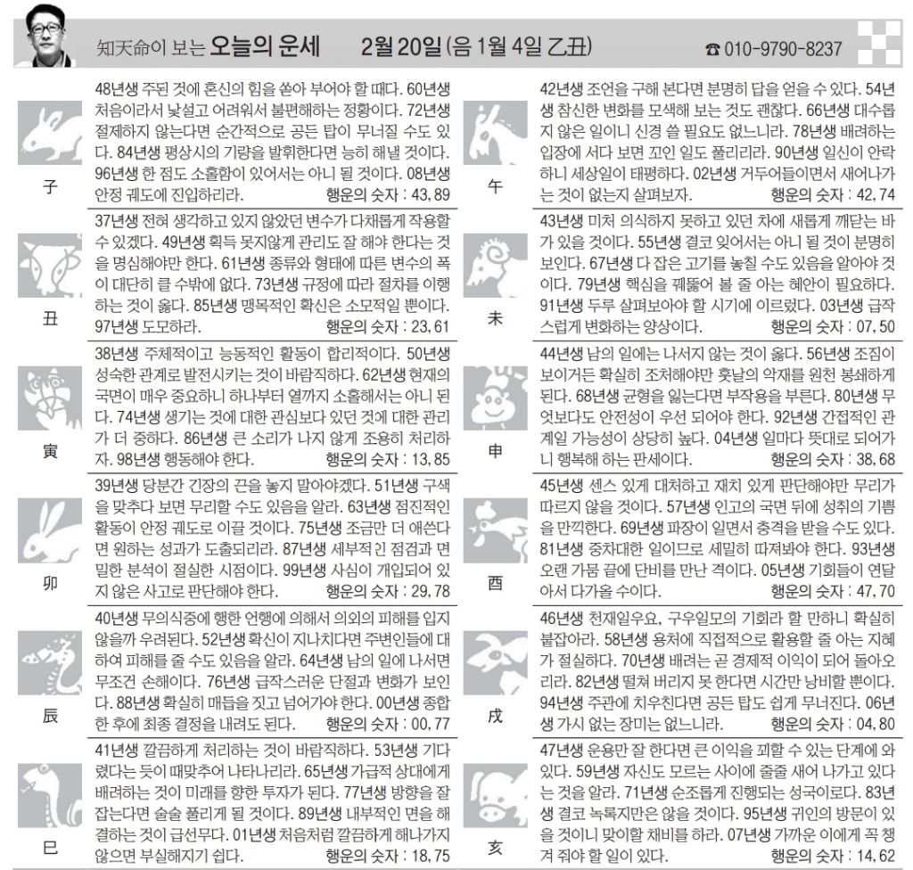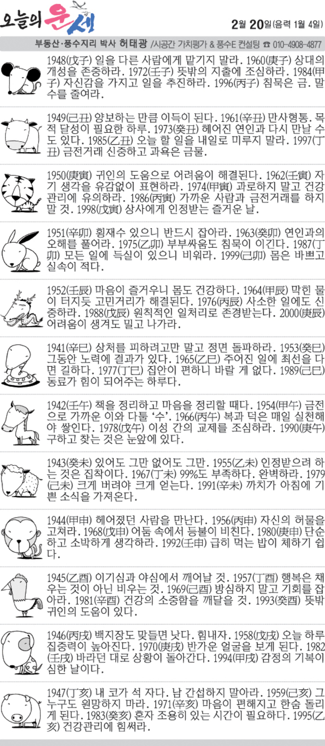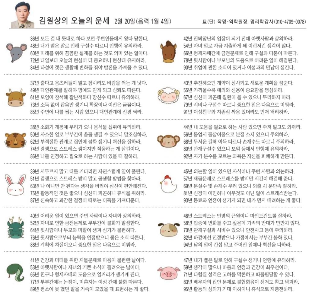 2월 20일 금요일 오늘의 운세 작성자난누군가또여긴어딘가.|작성시간26.02.20|조회수4,477 목록 댓글 13 글자크기 작게가 글자크기 크게가 다음검색 현재 게시글 추가 기능 열기 북마크 공유하기 신고 센터로 신고 댓글 댓글 13 댓글쓰기 답글쓰기 댓글 리스트 작성자클로제 헤딩 | 작성시간 26.02.20 복채요! 작성자5홉니다 | 작성시간 26.02.20 복채요 작성자에라스네츠 | 작성시간 26.02.20 복채요 작성자부처님 | 작성시간 26.02.20 복채요~! 작성자수원블루맨1 | 작성시간 26.02.20 복채요 댓글 전체보기