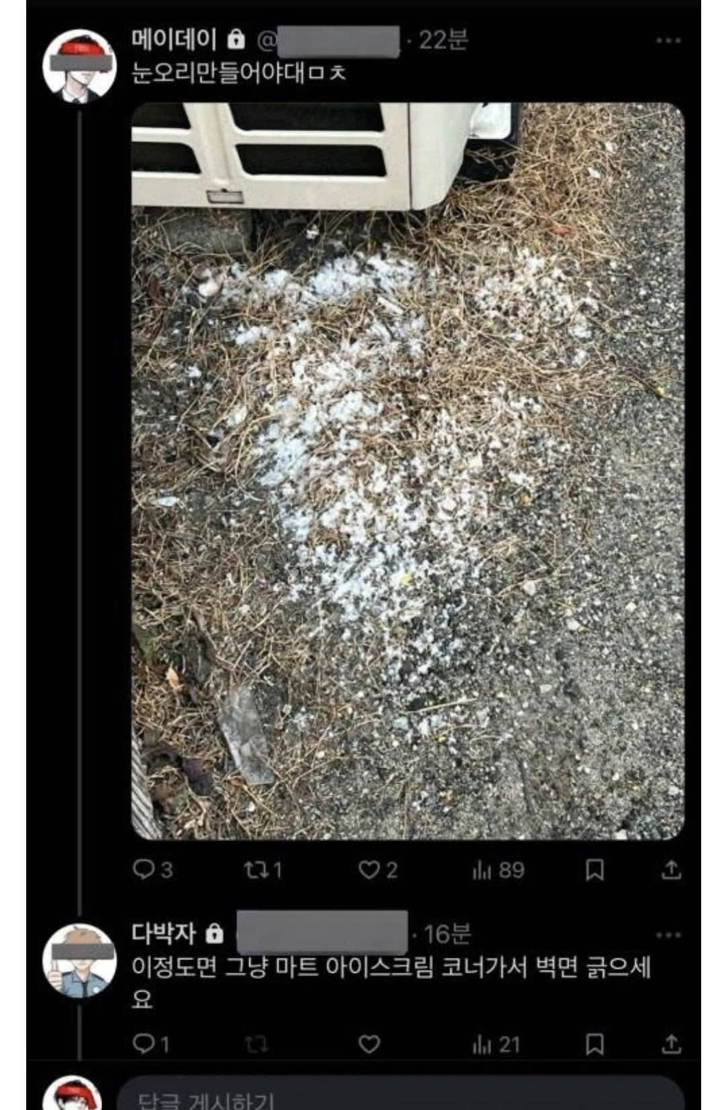 눈오리 만들고 싶었던 부산인 작성자가을날4|작성시간26.02.20|조회수7,172 목록 댓글 3 글자크기 작게가 글자크기 크게가 다음검색 현재 게시글 추가 기능 열기 북마크 공유하기 신고 센터로 신고 댓글 댓글 3 댓글쓰기 답글쓰기 댓글 리스트 작성자행교 | 작성시간 26.02.20 흙오리라도 작성자푸른쥐 | 작성시간 26.02.20 진흙으로 오리를 만든 다음에 밀가루를 뿌리는게 더 빠를지도... 작성자뽀무빵삑 | 작성시간 26.02.20 저 정도면 여름에 흙 많을때 만들어야됨 댓글 전체보기