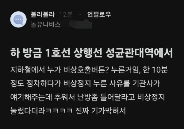 1호선 긴급 정차한 이유 작성자가을날4|작성시간26.02.20|조회수16,937 목록 댓글 5 글자크기 작게가 글자크기 크게가 다음검색 현재 게시글 추가 기능 열기 북마크 공유하기 신고 센터로 신고 댓글 댓글 5 댓글쓰기 답글쓰기 댓글 리스트 작성자맨소래담 | 작성시간 26.02.20 벌금 ㄱ 작성자소녀시대 윤아 | 작성시간 26.02.20 저거 벌금 쎄지 않나 작성자정예린2 | 작성시간 26.02.20 ㄷㄷㄷ 작성자이나경 | 작성시간 26.02.20 작성자서현진 | 작성시간 26.02.20 아니 온도 조절해달라고 연락하는 경로가 따로 있지않나왜 비상정지를 눌러 댓글 전체보기
