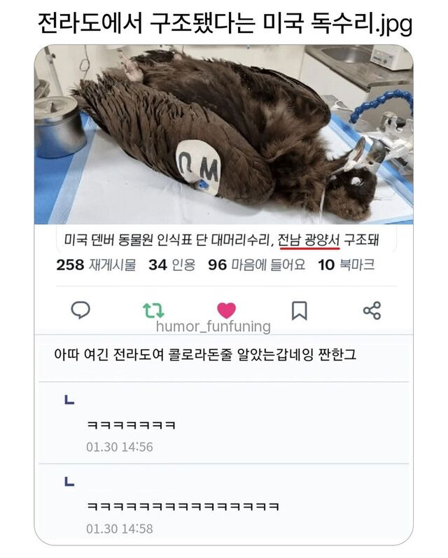전라도에서 구조된 미국 독수리.jpg 작성자Google|작성시간26.02.20|조회수10,237 목록 댓글 13 글자크기 작게가 글자크기 크게가 다음검색 현재 게시글 추가 기능 열기 북마크 공유하기 신고 센터로 신고 댓글 댓글 13 댓글쓰기 답글쓰기 댓글 리스트 작성자I’d rather be ashes than dust | 작성시간 26.02.20 ㅋㅋㅋ 작성자nifog | 작성시간 26.02.20 댄버 동물원에서 생활사를 관측하기 위해 몽골에 방생한 게 우리나라로 날아온 것 답댓글 작성자심수봉 | 작성시간 26.02.21 그쳐?ㅋㅋ 미국에서까진 못날아올듯 작성자정휘인 | 작성시간 26.02.20 ㅋㅋㅋㅋㄱㅋ 작성자SOWON | 작성시간 26.02.20 ㅋㅋㅋㅋㅋㅋ 댓글 전체보기