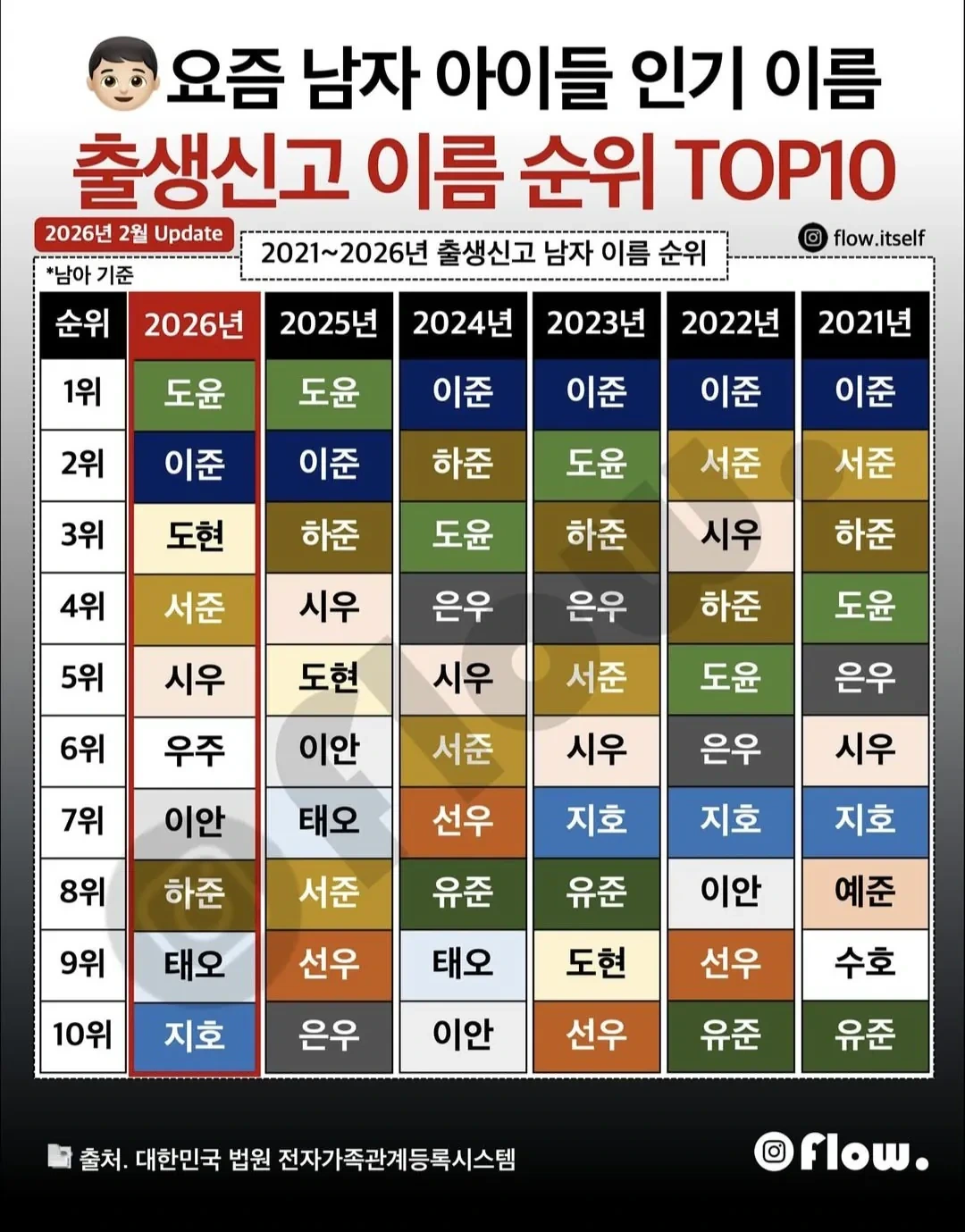 [기타]2021~2026년 출생신고 남자 이름 순위.. 작성자rade bogdanovic|작성시간26.02.22|조회수5,268 목록 댓글 2 글자크기 작게가 글자크기 크게가 다음검색 현재 게시글 추가 기능 열기 북마크 공유하기 신고 센터로 신고 댓글 댓글 2 댓글쓰기 답글쓰기 댓글 리스트 작성자Barcelona | 작성시간 26.02.22 다 고만고만 하네 이젠 돌림자 안 쓰는 사람들이 많은 건가 답댓글 작성자가보자귱 | 작성시간 26.02.22 저기서 여자버전은 또 이름 비슷해요ㅋㅋ이준 - 이서하준 - 하은시우 - 시아도윤 - 도아 등등... 댓글 전체보기