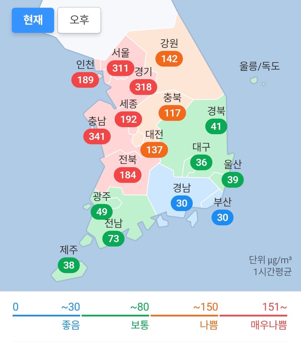[정보]현재 지역별 미세먼지/초미세먼지 작성자한교동|작성시간26.02.22|조회수4,230 목록 댓글 7 글자크기 작게가 글자크기 크게가 미세먼지초미세먼지 다음검색 현재 게시글 추가 기능 열기 북마크 공유하기 신고 센터로 신고 댓글 댓글 7 댓글쓰기 답글쓰기 댓글 리스트 작성자침착한수호자 | 작성시간 26.02.22 미쳣음 지금 ㄷㄷ 황사까지 더해져서 시야가 뿌옇게 필터낀거같음 작성자최희 | 작성시간 26.02.22 ??: 요즘 미세먼지는 문제가 거의 되지 않을 정도 작성자김해FC2008 | 작성시간 26.02.22 다행 작성자쓰루패스 | 작성시간 26.02.22 청정부산이네 작성자이나경 | 작성시간 26.02.22 으악.. 댓글 전체보기