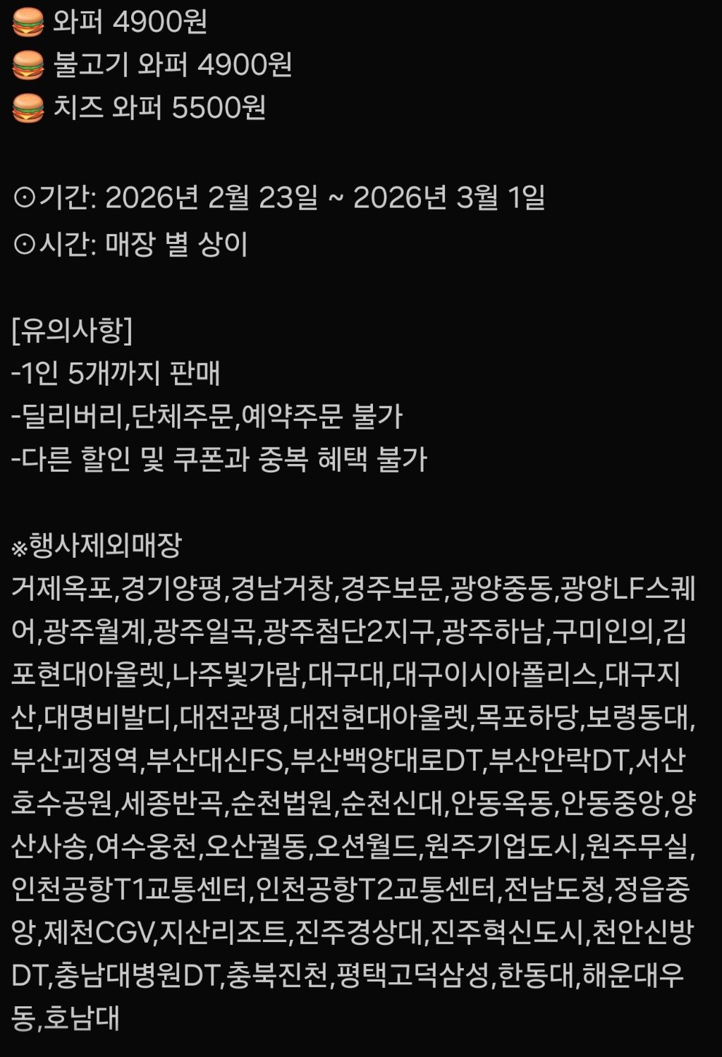 [음식]이번주 버거킹 '와퍼' 행사 작성자한교동|작성시간26.02.23|조회수6,961 목록 댓글 17 글자크기 작게가 글자크기 크게가 다음검색 현재 게시글 추가 기능 열기 북마크 공유하기 신고 센터로 신고 댓글 댓글 17 댓글쓰기 답글쓰기 댓글 리스트 작성자Cole Jermaine Palmer | 작성시간 26.02.23 이거다 작성자정예린2 | 작성시간 26.02.23 ㄷㄷㄷㄷ 작성자aoa최아 | 작성시간 26.02.23 포함킹! 작성자일요일 | 작성시간 26.02.23 앱으로 주문해야 할인받죠? 답댓글 작성자루니봤니스텔루이 | 작성시간 26.02.24 매장 키오스크에서 단품 선택하면 할인가격 적용되네요! 댓글 전체보기