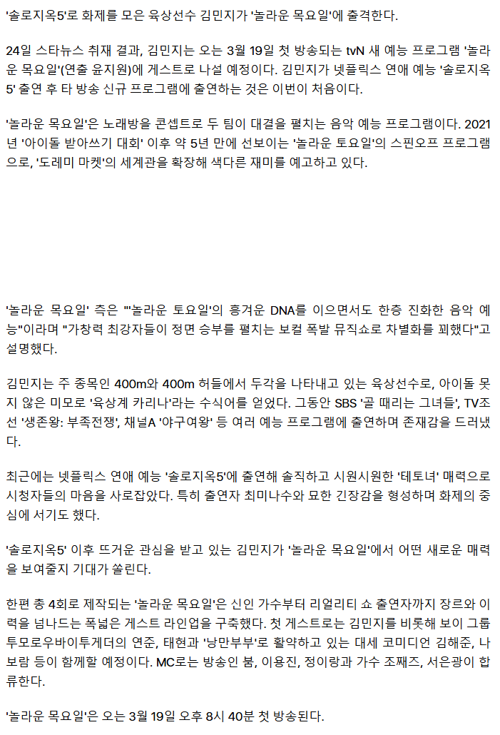 [기사][단독]'솔로지옥5' 김민지, 대세 된 '육상 카리나'..새예능 '놀목' 출격 작성자김바덕|작성시간26.02.24|조회수8,172 목록 댓글 5 글자크기 작게가 글자크기 크게가 https://v.daum.net/v/20260224151044675[단독]'솔로지옥5' 김민지, 대세 된 '육상 카리나'..새예능 '놀목' 출격[스타뉴스 | 윤성열 기자] /사진=김민지 SNS '솔로지옥5'로 화제를 모은 육상선수 김민지가 '놀라운 목요일'에 출격한다. 24일 스타뉴스 취재 결과, 김민지는 오는 3월 19일 첫 방송되는 tvN 새 예능 v.daum.net 육칼 김민지 다음검색 현재 게시글 추가 기능 열기 북마크 공유하기 신고 센터로 신고 댓글 댓글 5 댓글쓰기 답글쓰기 댓글 리스트 작성자주거불안 | 작성시간 26.02.24 솔지 출연 악수 아니었나 답댓글 작성자마포구존버 | 작성시간 26.02.24 솔지를 나오는이유가 악수든아니든간에 화제는된다는점이죠ㅋㅋ 작성자정예린2 | 작성시간 26.02.24 놀라운목요일 ㄷㄷ 작성자펠라이니 니가 사람 팰 나이니 | 작성시간 26.02.24 요일별로 다 만들려나 작성자Clarence Seedorf | 작성시간 26.02.24 놀고 먹고 부럽네 댓글 전체보기