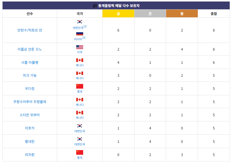 [스포츠]동계올림픽 쇼트트랙 남여 최다 메달 수상자.jpg 작성자탱구|작성시간26.02.24|조회수2,738 목록 댓글 8 글자크기 작게가 글자크기 크게가 다음검색 현재 게시글 추가 기능 열기 북마크 공유하기 신고 센터로 신고 댓글 댓글 8 댓글쓰기 답글쓰기 댓글 리스트 작성자짜스파 | 작성시간 26.02.24 안현수 금6개 대단하긴하네.. 작성자강아지 | 작성시간 26.02.24 남자 김동성 선수는 순위안에 못드나요? 답댓글 작성자라일라일 | 작성시간 26.02.24 금1 은1 작성자정예린2 | 작성시간 26.02.24 ㄷㄷㄷㄷ 작성자엘버풀 | 작성시간 26.02.24 최민정ㄷ 댓글 전체보기