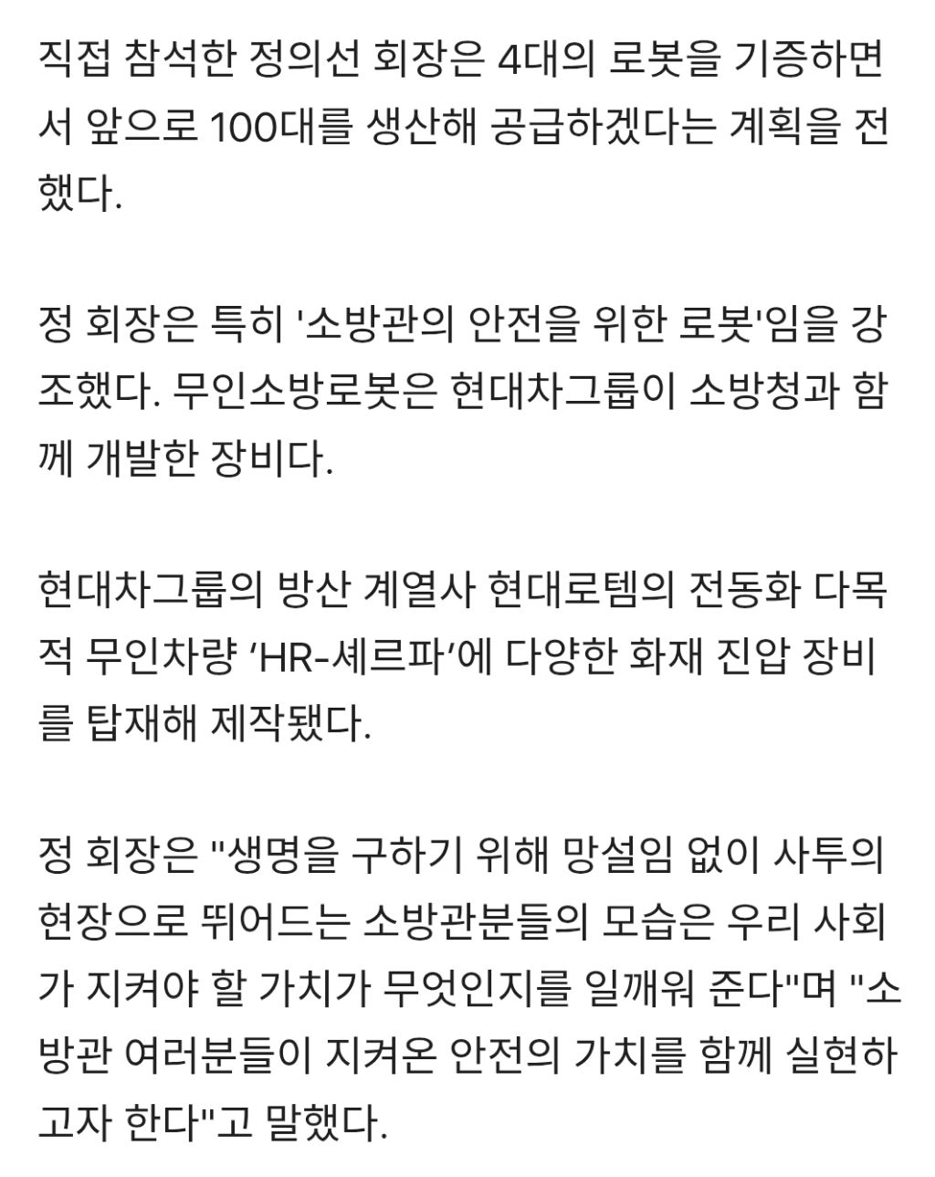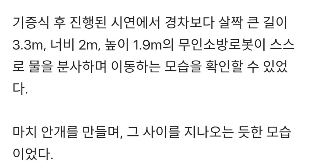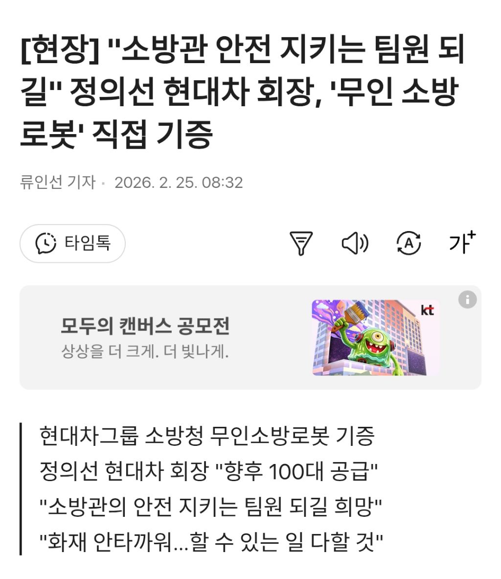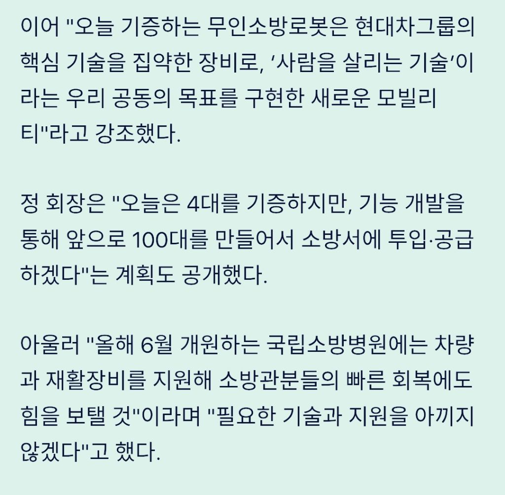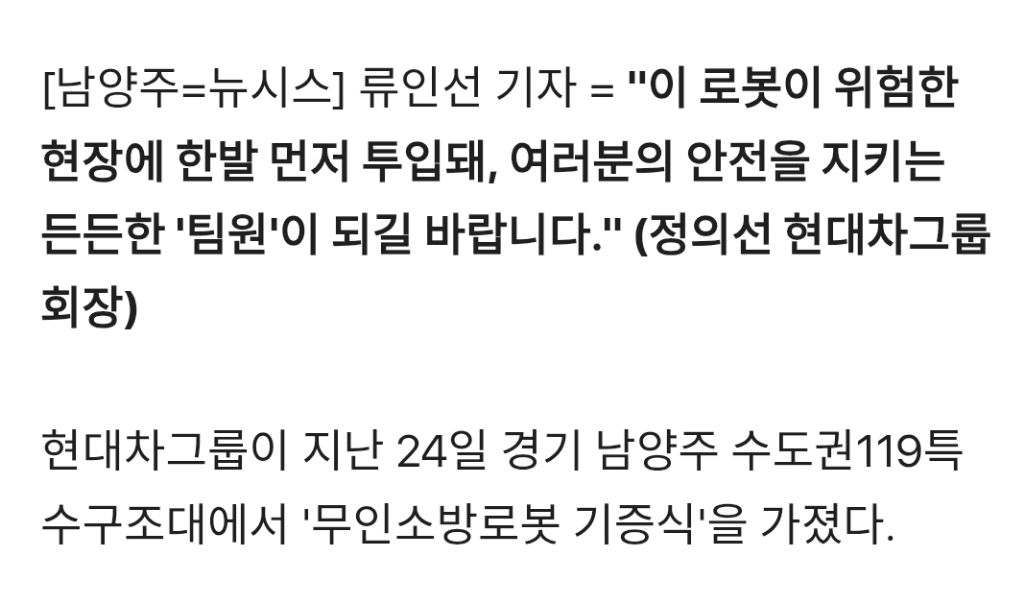 [기사]"소방관 안전 지키는 팀원 되길" 정의선 현대차 회장, '무인 소방로봇' 직접 기증 작성자러바오|작성시간26.02.25|조회수3,193 목록 댓글 6 글자크기 작게가 글자크기 크게가 https://v.daum.net/v/20260225083246257[현장] "소방관 안전 지키는 팀원 되길" 정의선 현대차 회장, '무인 소방로봇' 직접 기증[남양주=뉴시스] 류인선 기자 = "이 로봇이 위험한 현장에 한발 먼저 투입돼, 여러분의 안전을 지키는 든든한 '팀원'이 되길 바랍니다." (정의선 현대차그룹 회장) 현대차그룹이 지난 24일 경기 남v.daum.net 다음검색 현재 게시글 추가 기능 열기 북마크 공유하기 신고 센터로 신고 댓글 댓글 6 댓글쓰기 답글쓰기 댓글 리스트 작성자기아타이거즈 | 작성시간 26.02.25 갓의선 작성자공격 축구 | 작성시간 26.02.25 갓의선!!!현대차!!! 작성자오프로디테 | 작성시간 26.02.25 ???:소방...로봇.... 맞지? 답댓글 작성자김묘성 | 작성시간 26.02.25 ??? : 앞에 포신을 갈아 끼우면 답댓글 작성자오프로디테 | 작성시간 26.02.25 김묘성 ???:물... 쏘는거 맞지? 댓글 전체보기