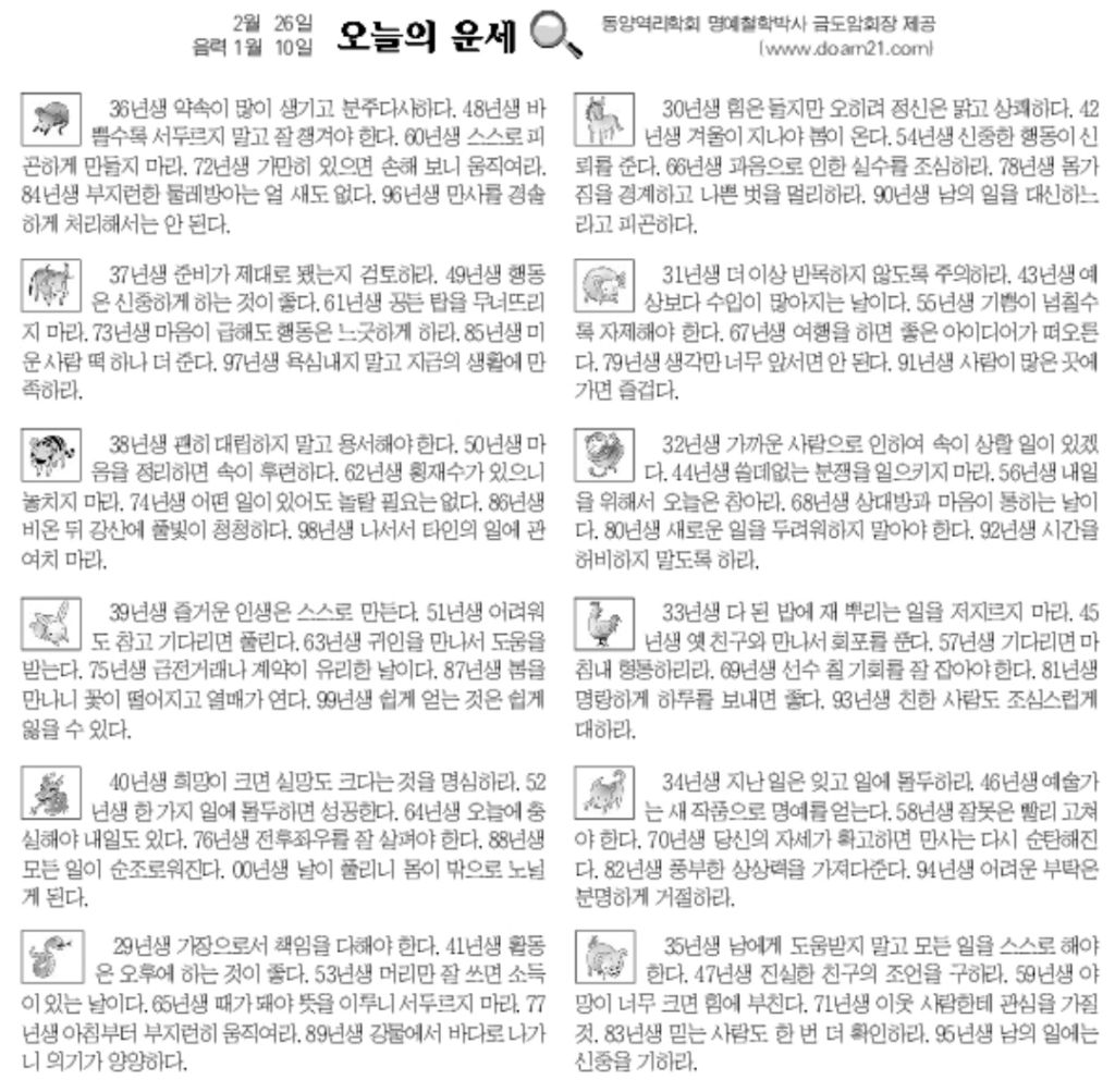 2월 26일 목요일 오늘의 운세 작성자난누군가또여긴어딘가.|작성시간26.02.26|조회수3,816 목록 댓글 13 글자크기 작게가 글자크기 크게가 다음검색 현재 게시글 추가 기능 열기 북마크 공유하기 신고 센터로 신고 댓글 댓글 13 댓글쓰기 답글쓰기 댓글 리스트 작성자에라스네츠 | 작성시간 26.02.26 복채요 작성자Andrea Pirlo 21 | 작성시간 26.02.26 복채요! 작성자GENESIS | 작성시간 26.02.26 복채요!! 작성자Hugo | 작성시간 26.02.26 다 다르다는점이 웃기네 ㅋㅋ 작성자石村 | 작성시간 26.02.26 복채요~! 댓글 전체보기