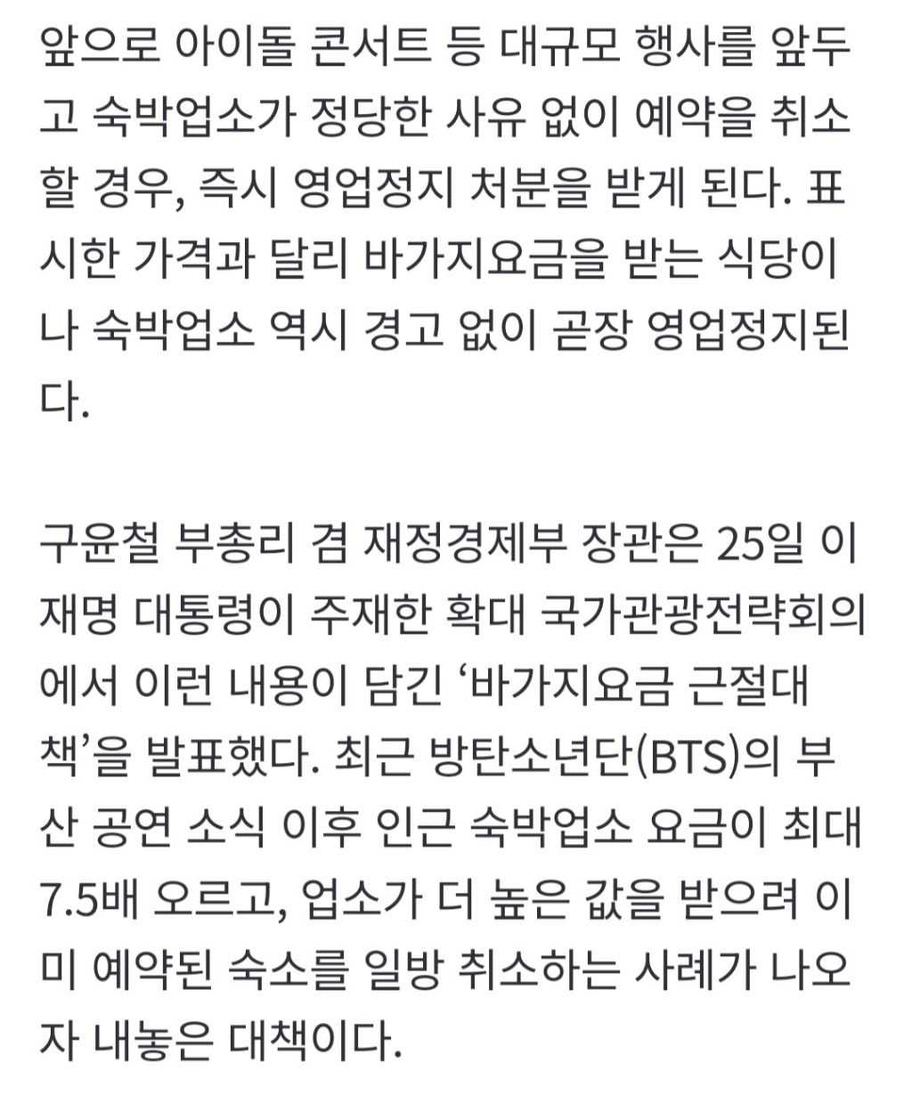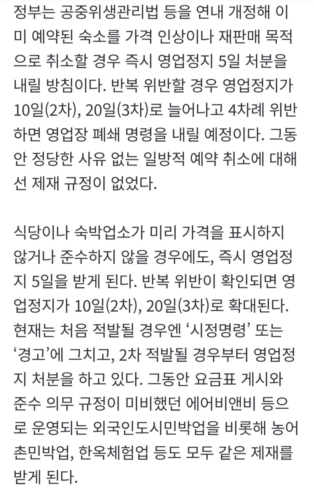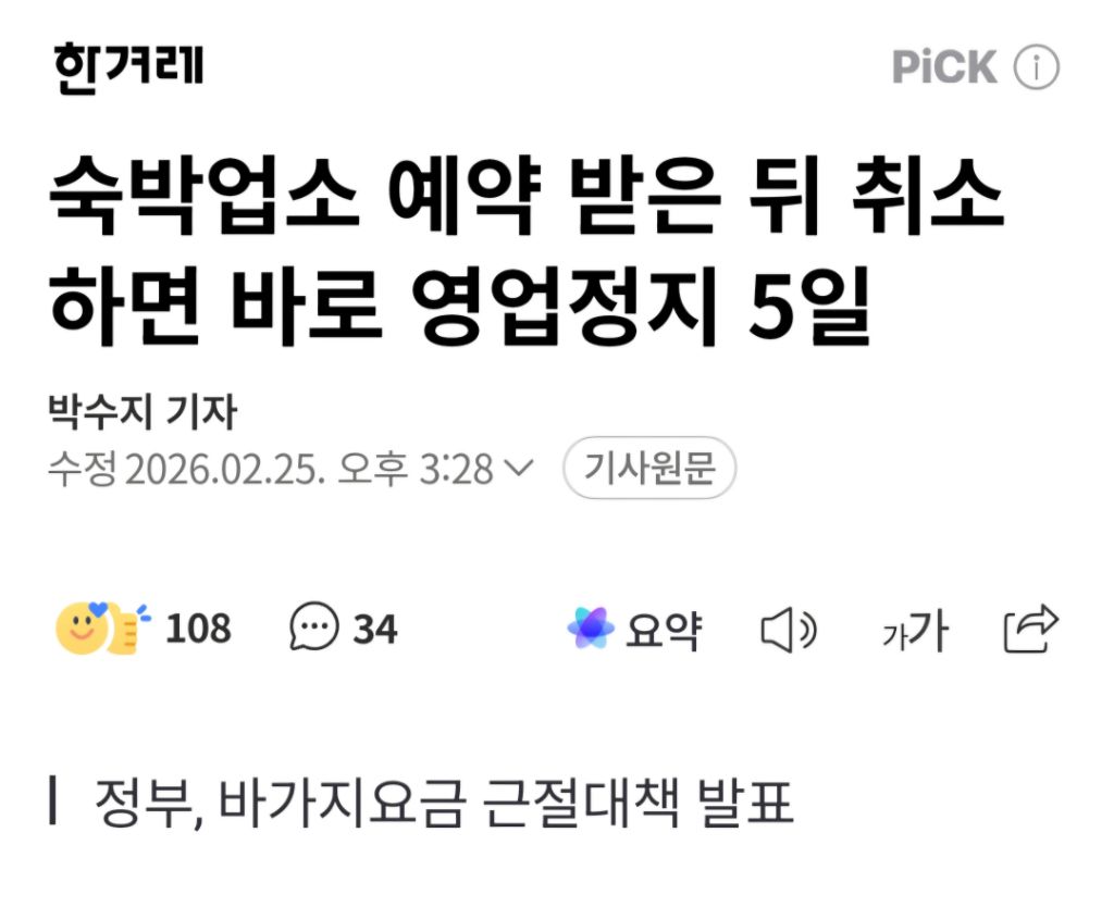 [기사]숙박업소 예약 받은 뒤 취소하면 바로 영업정지 5일 작성자음교수|작성시간26.02.26|조회수9,597 목록 댓글 3 글자크기 작게가 글자크기 크게가 https://n.news.naver.com/article/028/0002793117숙박업소 예약 받은 뒤 취소하면 바로 영업정지 5일앞으로 아이돌 콘서트 등 대규모 행사를 앞두고 숙박업소가 정당한 사유 없이 예약을 취소할 경우, 즉시 영업정지 처분을 받게 된다. 표시한 가격과 달리 바가지요금을 받는 식당이나 숙박업소 n.news.naver.com 다음검색 현재 게시글 추가 기능 열기 북마크 공유하기 신고 센터로 신고 댓글 댓글 3 댓글쓰기 답글쓰기 댓글 리스트 작성자죽군이 | 작성시간 26.02.26 바가지값에 비하면 좀 짧은거 같은데 더 길게 해주지 작성자파랑 | 작성시간 26.02.26 한 달은 해야지.. 작성자짤순태 | 작성시간 26.02.26 취소한 기간 포함해서 영업정지 시켰으면 좋겠다 댓글 전체보기