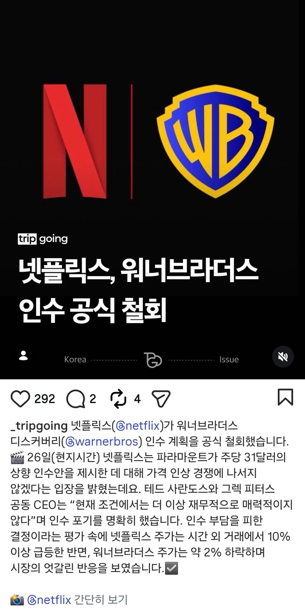 답댓글 작성자영화연화 작성시간 26.02.27 H_Crespo 단순 사용자 입장에서는 좋은데, 운영이나 주주 입장에서는 악재였습니다. 부채가 많은데 투입되는 금액도 만만치 않고, 투자금액에 따른 지출 불가로 자사주 매입은 물론 배당금 가능성도 없애버렸으니까요. 더군다나 상하원 쪽에서 반독점법 위반 여부 조사에 트럼프는 넷플 이사회 중 일원이 민주당 출신에 정치적 앞잡이라는 이유로 쫓아내라고 압박해대니 위험부담이 컸습니다. 또, 파라마운트쪽 사모펀드가 트럼프 사위가 속해있다는 것도 어느정도 영향이 있는거 같기도 하구요.