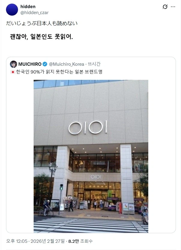 한국인 90프로가 읽지 못하는 일본 브랜드명 작성자ChatGPT|작성시간26.02.27|조회수13,234 목록 댓글 24 글자크기 작게가 글자크기 크게가 저 브랜드 이름은 마루이다 왜 0101을 마루이로 읽냐면 일본에서 전번 첫자리인 0101를 마루이라고 불러서다 다음검색 현재 게시글 추가 기능 열기 북마크 공유하기 신고 센터로 신고 댓글 댓글 24 댓글쓰기 답글쓰기 댓글 리스트 작성자Liverpool FC | 작성시간 26.02.27 22 작성자PLANTALE | 작성시간 26.02.27 이이 작성자I’d rather be ashes than dust | 작성시간 26.02.27 오이 작성자넥슨 | 작성시간 26.02.27 이이 작성자잔소리 봇 | 작성시간 26.02.28 외외 댓글 전체보기