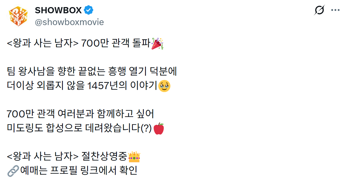 [영화]'왕과 사는 남자' 700만 돌파 작성자서스날|작성시간26.02.27|조회수3,341 목록 댓글 24 글자크기 작게가 글자크기 크게가 2월 4일 개봉14일차 300만15일차 400만18일차 500만20일차 600만24일차 700만 다음검색 현재 게시글 추가 기능 열기 북마크 공유하기 신고 센터로 신고 댓글 댓글 24 댓글쓰기 답글쓰기 댓글 리스트 작성자오스카 아이작 | 작성시간 26.02.27 천만가자 작성자Google | 작성시간 26.02.27 천만 확정이네 작성자MUTD브루노페르난데스 | 작성시간 26.02.27 천만가자 작성자케빈De브라위너 | 작성시간 26.02.27 천만 가자!! 작성자이나경 | 작성시간 26.02.28 ㄷㄷㄷ 댓글 전체보기