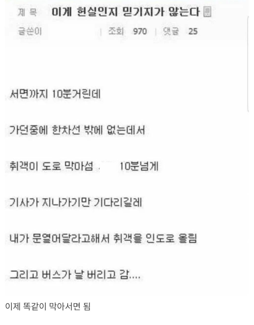 이게 현실인지 믿기지가 않는다 작성자러바오|작성시간26.02.27|조회수4,591 목록 댓글 5 글자크기 작게가 글자크기 크게가 다음검색 현재 게시글 추가 기능 열기 북마크 공유하기 신고 센터로 신고 댓글 댓글 5 댓글쓰기 답글쓰기 댓글 리스트 작성자정예린2 | 작성시간 26.02.27 어떻해 ㄷㄷ 작성자무무링 | 작성시간 26.02.28 아니 기사님 ㅠㅠㅠ 작성자ArsenalFC | 작성시간 26.02.28 구해주니 버림 ㄷㄷ 작성자인천서포터즈 | 작성시간 26.02.28 취객: 나도 그렇게 버려졌었지..... 작성자가운데의맙소사 | 작성시간 26.02.28 버스기사 ㄷㄷ 댓글 전체보기