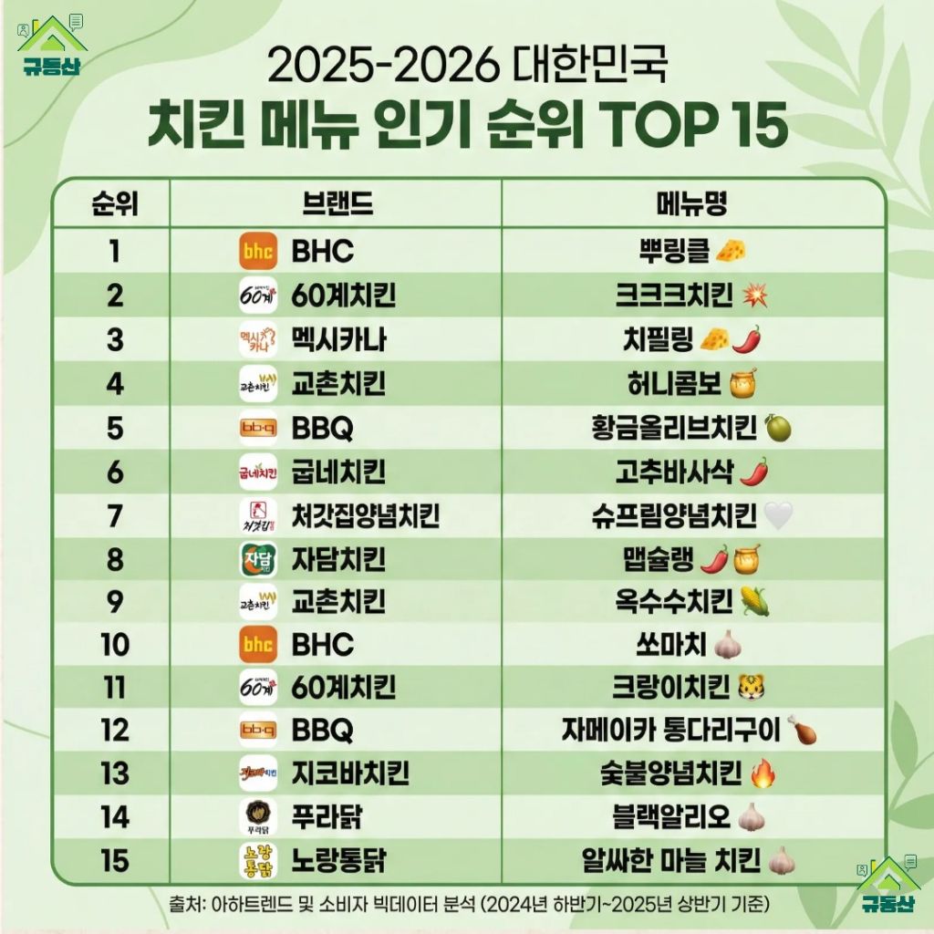 2025-2026 대한민국 치킨 메뉴 인기 순위 TOP 15 작성자ChatGPT|작성시간26.02.28|조회수1,150 목록 댓글 8 글자크기 작게가 글자크기 크게가 다음검색 현재 게시글 추가 기능 열기 북마크 공유하기 신고 센터로 신고 댓글 댓글 8 댓글쓰기 답글쓰기 댓글 리스트 작성자가을아 | 작성시간 26.02.28 뿌링클 생각도 못했는데 작성자Vicario | 작성시간 26.02.28 뿌링클 최악이고크크크 치킨이 존맛...방금도 먹음 작성자ManchesterUnited | 작성시간 26.02.28 크크크 우리집 애들이 환장함 ㅎㅎ 작성자짤순태 | 작성시간 26.02.28 크크크가 확실히 괜춘해 작성자I.B.I LUV | 작성시간 26.02.28 후라이드나 양념만 먹어서 저 차트에서 먹어 본 거는 없군요 댓글 전체보기