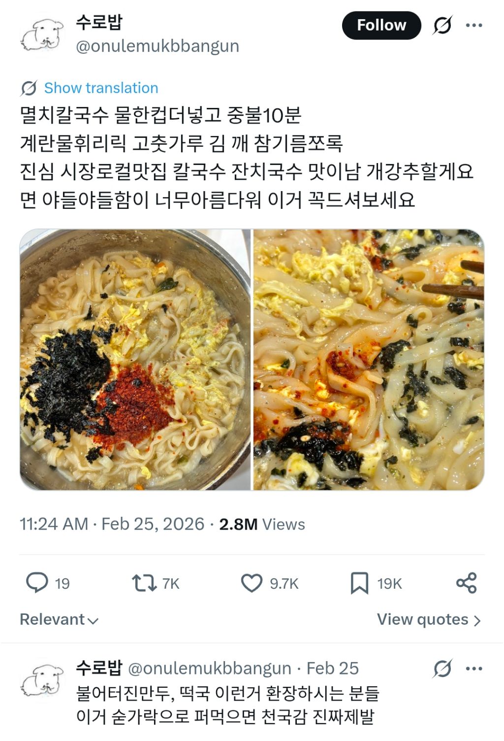 멸치칼국수 레시피 작성자러바오|작성시간26.03.01|조회수2,233 목록 댓글 3 글자크기 작게가 글자크기 크게가 https://x.com/onulemukbbangun/status/2026483353332175076 다음검색 현재 게시글 추가 기능 열기 북마크 공유하기 신고 센터로 신고 댓글 댓글 3 댓글쓰기 답글쓰기 댓글 리스트 작성자림프비스킷 | 작성시간 26.03.01 ㄷㄱ 작성자정예린2 | 작성시간 26.03.01 ㄷㄱ 작성자I.B.I LUV | 작성시간 26.03.01 꾸덕하게 ㅇㅇ 댓글 전체보기