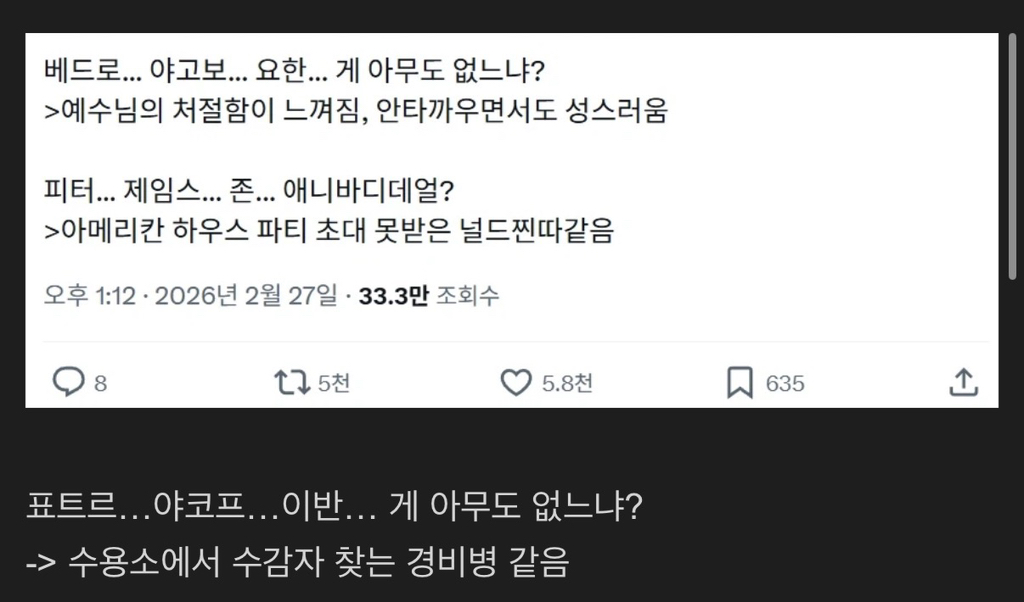 성경 속 인명을 영어로 안 쓰는 이유.jpg 작성자Google|작성시간26.03.01|조회수5,942 목록 댓글 6 글자크기 작게가 글자크기 크게가 https://humoruniv.com/pds1401729 다음검색 현재 게시글 추가 기능 열기 북마크 공유하기 신고 센터로 신고 댓글 댓글 6 댓글쓰기 답글쓰기 댓글 리스트 작성자서초패왕 항우 | 작성시간 26.03.01 야곱은 제이콥아닌가? 답댓글 작성자William SALIBA | 작성시간 26.03.01 오 찾아보니 이러네요 신기.. 이미지 확대 작성자Starbucks | 작성시간 26.03.01 출애굽기가 엑소더스죠 작성자Noel Gallagher | 작성시간 26.03.01 애굽민수 작성자맨밥 | 작성시간 26.03.01 성굉에 이집트는 애굽, 파라오는 바로라고 나오죠. 아마도 아시리아는 앗수르겠죠? 댓글 전체보기