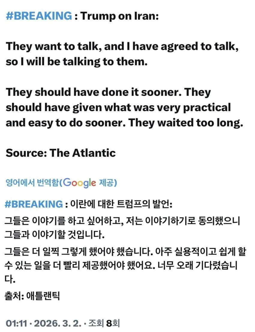 [기사]트럼프 : 이란녀석들 진작에 대화 요청 하지 ㅎ 작성자데니스 코펜하겐|작성시간26.03.02|조회수8,685 목록 댓글 5 글자크기 작게가 글자크기 크게가 이제 아주 기세 등등하군요 다음검색 현재 게시글 추가 기능 열기 북마크 공유하기 신고 센터로 신고 댓글 댓글 5 댓글쓰기 답글쓰기 댓글 리스트 작성자Mateja Kezman | 작성시간 26.03.02 new 넌 안죽니 작성자러바오 | 작성시간 26.03.02 new (당분간 규제풀렸으나 정치나 기사말머리 쓰셔야할거예요..) 답댓글 작성자데니스 코펜하겐 작성자 본인 여부 작성자 | 작성시간 26.03.02 new 기사로 수정했슴당 답댓글 작성자러바오 | 작성시간 26.03.02 new 데니스 코펜하겐 😍 작성자아메리카노 | 작성시간 26.03.02 new 괴물이네… 댓글 전체보기
