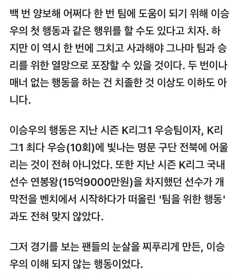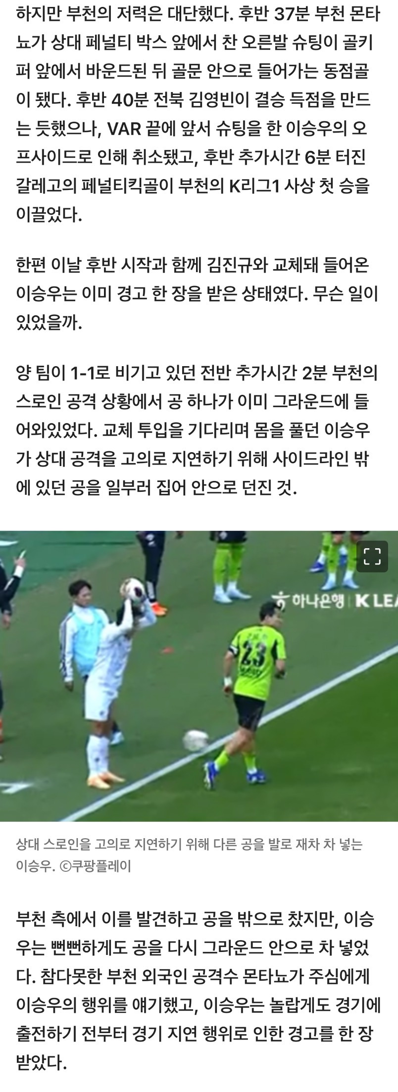 [축구기사]이승우, 스로인 지연하려 '다른 공 던지고-돌아오니 다시 차넣고'... 무슨 매너인가 작성자solid|작성시간26.03.02|조회수4,705 목록 댓글 18 글자크기 작게가 글자크기 크게가 https://v.daum.net/v/20260302050153110이승우, 스로인 지연하려 '다른 공 던지고-돌아오니 다시 차넣고'... 무슨 매너인가[스포츠한국 김성수 기자] '승격팀' 부천FC가 K리그1 개막전부터 '챔피언' 전북 현대를 잡는 극장 이변을 썼다. 하지만 이 경기에서 나온 전북 이승우의 비매너 플레이는 지켜보는 팬들의 눈살을 v.daum.net 다음검색 현재 게시글 추가 기능 열기 북마크 공유하기 신고 센터로 신고 댓글 댓글 18 댓글쓰기 답글쓰기 댓글 리스트 작성자흰둥흰둥이 | 작성시간 26.03.02 똥매너여도 팀을 위한 영리한 행동 작성자나이샤샤 | 작성시간 26.03.02 국대를 못가는 이유가 있는듯 작성자마하제로 | 작성시간 26.03.02 연봉탑이라서 뭐라도 보여줘야하는 부담감인가.. 작성자디지몬 | 작성시간 26.03.02 어제 헐리웃 액션도 그렇고 요즘은 작년말부터해서 거의 3라운데에 한 번은 논란을 만드는 느낌… 작성자천사와악마 | 작성시간 26.03.02 이제 나이가 슬슬 고참급으로 갈 때 인데.. 댓글 전체보기