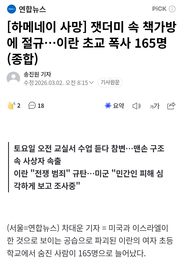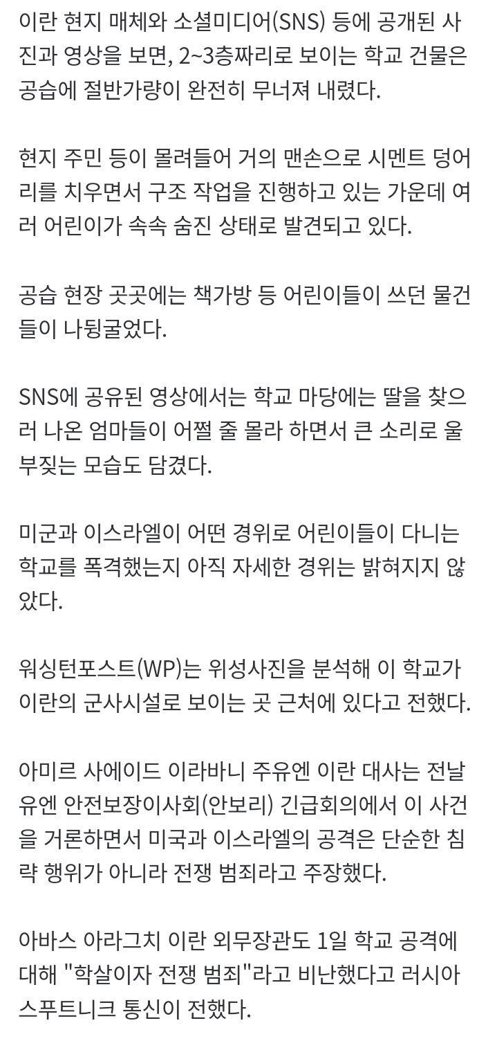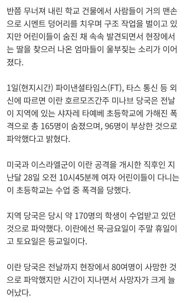 [기사][하메네이 사망] 잿더미 속 책가방에 절규…이란 초교 폭사 165명(종합).gisa 작성자강동구주민 3|작성시간26.03.02|조회수9,670 목록 댓글 22 글자크기 작게가 글자크기 크게가 [하메네이 사망] 잿더미 속 책가방에 절규…이란 초교 폭사 165명(종합)토요일 오전 교실서 수업 듣다 참변…맨손 구조 속 사상자 속출 이란 "전쟁 범죄" 규탄…미군 "민간인 피해 심각하게 보고 조사중" 미국과 이스라엘이 한 것으로 보이는 공습으로 파괴된 이란의 n.news.naver.com 다음검색 현재 게시글 추가 기능 열기 북마크 공유하기 신고 센터로 신고 댓글 댓글 22 댓글쓰기 답글쓰기 댓글 리스트 작성자수박쥬스 | 작성시간 26.03.02 new 하.. 작성자Alexis Sanchez | 작성시간 26.03.02 new .. 작성자잭스의신 | 작성시간 26.03.02 new 마음이 울적해지네요 작성자파란사과 | 작성시간 26.03.02 new 하워드 진이 비판한 미국 패권의 무고한 이들을 향한 폭력과 학살의 역사는 아직도 현재 진행형이네요. 작성자밥가져와밥 | 작성시간 10:19 new 이건 전쟁범죄지 미친 ㅅㄲ들이 댓글 전체보기