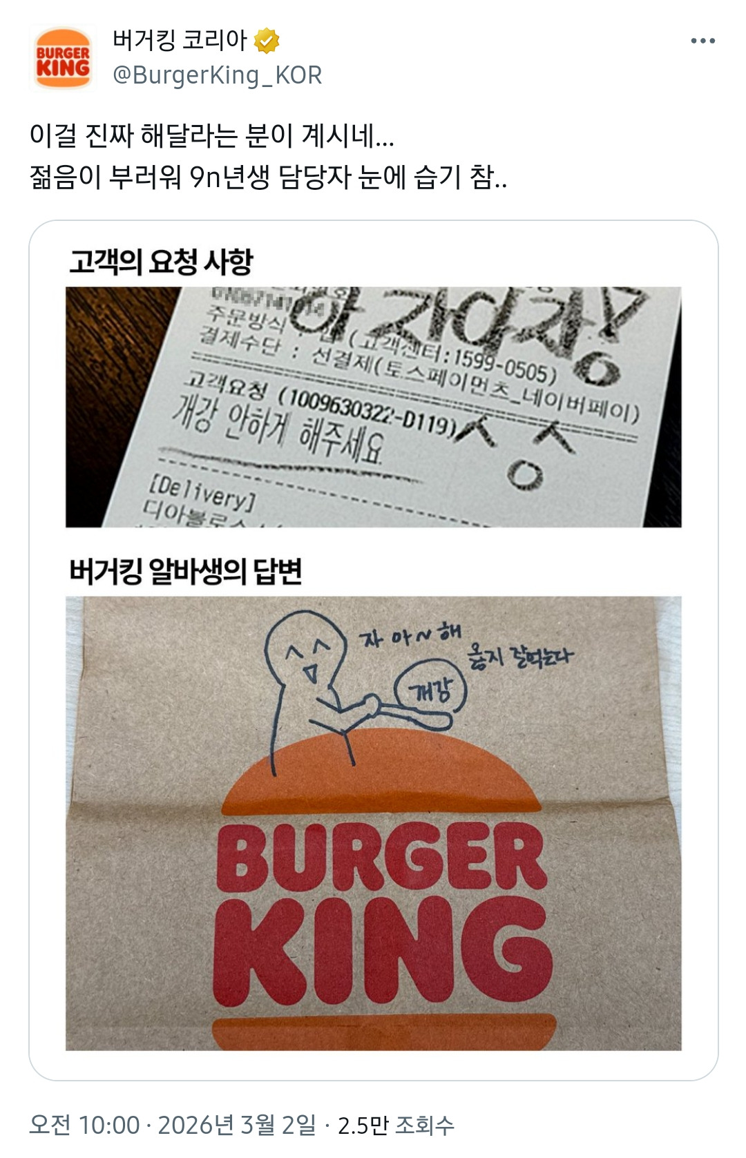 [유머]버거킹 고객요청: 개강 안하게 해주세요 작성자서스날|작성시간26.03.02|조회수11,597 목록 댓글 7 글자크기 작게가 글자크기 크게가 다음검색 현재 게시글 추가 기능 열기 북마크 공유하기 신고 센터로 신고 댓글 댓글 7 댓글쓰기 답글쓰기 댓글 리스트 작성자에라스네츠 | 작성시간 26.03.02 ㅋㅋㅋㅋㅋ 작성자오스먼트 | 작성시간 26.03.02 ㅋㅋㅋㅋㅋㅋㅋㅋㅋㅋ 작성자그래도아직은탱구 | 작성시간 26.03.02 ㅋㅋㅋㅋㅋㅋㅋ 작성자서현진 | 작성시간 26.03.02 ㅋㅋㅋㅋㅋㅋㅋㅋ 작성자Andrea Pirlo 21 | 작성시간 26.03.02 ㅋㅋㅋㅋㅋ 댓글 전체보기