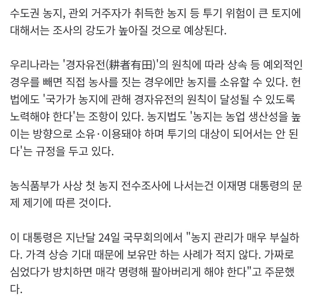 대도시 인근에서 상속, 주말농장으로 농지 소유한 사람들은 다 투기목적임. 진짜 도외지 시골에는 주말농장 농지 소유한 사람 없음.
