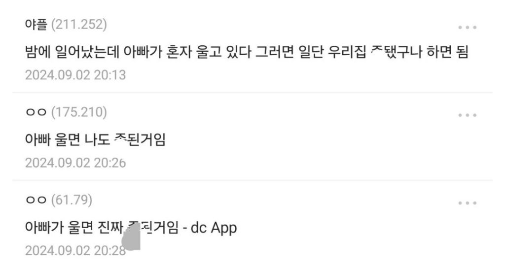 가족별 울 때 반응 작성자러바오|작성시간26.03.03|조회수3,741 목록 댓글 1 글자크기 작게가 글자크기 크게가 다음검색 현재 게시글 추가 기능 열기 북마크 공유하기 신고 센터로 신고 댓글 댓글 1 댓글쓰기 답글쓰기 댓글 리스트 작성자Tensegrity Universe and Philosophy | 작성시간 26.03.03 new 아빠가 드라마 보고 울면? 댓글 전체보기