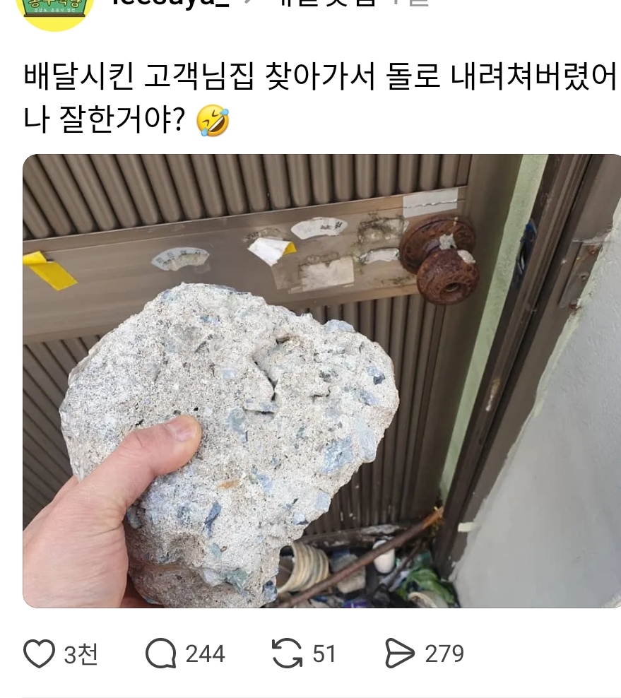 배달시킨 고객집 찾아가서 돌로 내려쳐버린 사장님 작성자러바오|작성시간26.03.03|조회수14,437 목록 댓글 8 글자크기 작게가 글자크기 크게가 https://www.threads.com/@leesuya_/post/DVXIXeKEsSC 다음검색 현재 게시글 추가 기능 열기 북마크 공유하기 신고 센터로 신고 댓글 댓글 8 댓글쓰기 답글쓰기 댓글 리스트 작성자담시즌엔 우승하나 | 작성시간 26.03.03 new ㅋㅋㅋㅋ 작성자인천서포터즈 | 작성시간 26.03.03 new 녹이 ㄷ ㄷ ㄷ파상풍 걸리겠네 ㅠㅜ 작성자tnatropmI | 작성시간 26.03.03 new ㄷㄷ 작성자I.B.I LUV | 작성시간 26.03.03 new 아니 문은 안 바꾸나... 작성자Tensegrity Universe and Philosophy | 작성시간 26.03.03 new 아우.. 남일이 아니다. 우리 부모님집 같네. 아부지 제발 초인종 좀 바꾸이소 댓글 전체보기