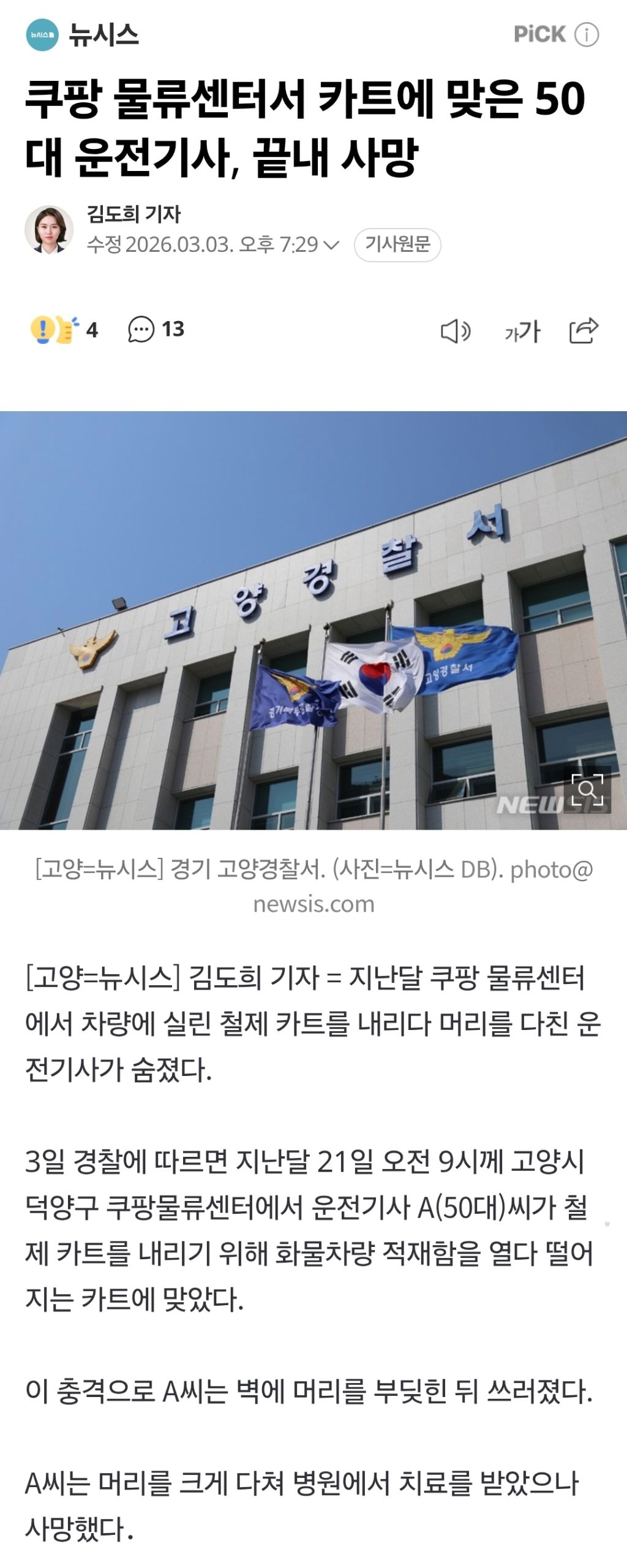 [기사]쿠팡 물류센터서 카트에 맞은 50대 운전기사, 끝내 사망 작성자담곰이|작성시간26.03.03|조회수6,309 목록 댓글 6 글자크기 작게가 글자크기 크게가 https://n.news.naver.com/article/003/0013799085?sid=102쿠팡 물류센터서 카트에 맞은 50대 운전기사, 끝내 사망지난달 쿠팡 물류센터에서 차량에 실린 철제 카트를 내리다 머리를 다친 운전기사가 숨졌다. 3일 경찰에 따르면 지난달 21일 오전 9시께 고양시 덕양구 쿠팡물류센터에서 운전기사 A(50대)씨가 철n.news.naver.com 다음검색 현재 게시글 추가 기능 열기 북마크 공유하기 신고 센터로 신고 댓글 댓글 6 댓글쓰기 답글쓰기 댓글 리스트 작성자코징이 | 작성시간 26.03.03 new 아이고 ㅜㅜ 작성자오스먼트 | 작성시간 26.03.03 new ㅠㅠ 작성자김바덕 | 작성시간 26.03.03 new ㅠㅠ 작성자정예린2 | 작성시간 26.03.03 new ㅠㅠ 작성자데니스 코펜하겐 | 작성시간 26.03.03 new ㅠㅠㅠㅠ 유족분들은 산재사망사고 꼭 받아내시길...ㅠㅠㅠ 댓글 전체보기