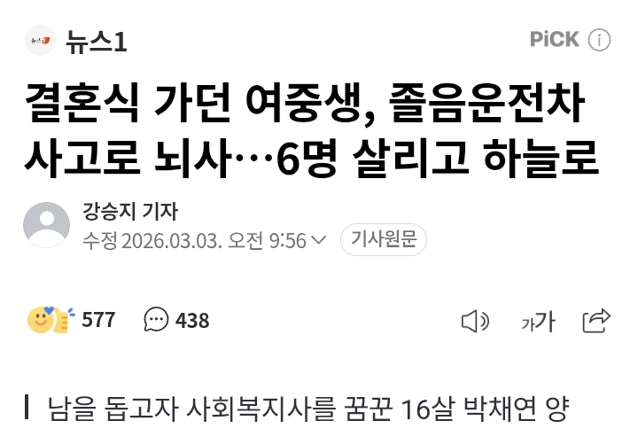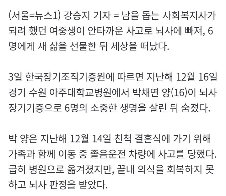 [기사]결혼식 가던 여중생, 졸음운전차 사고로 뇌사…6명 살리고 하늘로.gisa 작성자강동구주민 3|작성시간26.03.03|조회수10,444 목록 댓글 18 글자크기 작게가 글자크기 크게가 결혼식 가던 여중생, 졸음운전차 사고로 뇌사…6명 살리고 하늘로남을 돕는 사회복지사가 되려 했던 여중생이 안타까운 사고로 뇌사에 빠져, 6명에게 새 삶을 선물한 뒤 세상을 떠났다. 3일 한국장기조직기증원에 따르면 지난해 12월 16일 경기 수원 아주대학교n.news.naver.com 다음검색 현재 게시글 추가 기능 열기 북마크 공유하기 신고 센터로 신고 댓글 댓글 18 댓글쓰기 답글쓰기 댓글 리스트 작성자이나경 | 작성시간 26.03.03 new 아이고... 작성자행벅 | 작성시간 26.03.03 new 삼가 고인의 명복을 빕니다 작성자에피소드 | 작성시간 26.03.03 new 삼가 고인의 명복을 빕니다 작성자spursSPURS | 작성시간 00:40 new 삼가 고인의 명복을 빕니다 작성자SOWON | 작성시간 02:29 new 삼가 고인의 명복을 빕니다. 댓글 전체보기