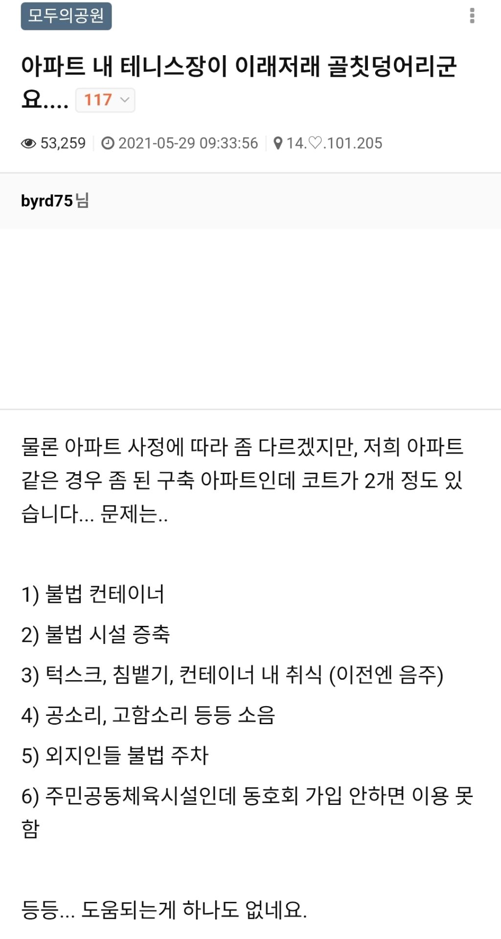 주차공간 부족, 소음, 기타 문제로 철거 원하는 입주민과 동호회 회원들 사이 분쟁이 심심치 않게 발생한다고 함