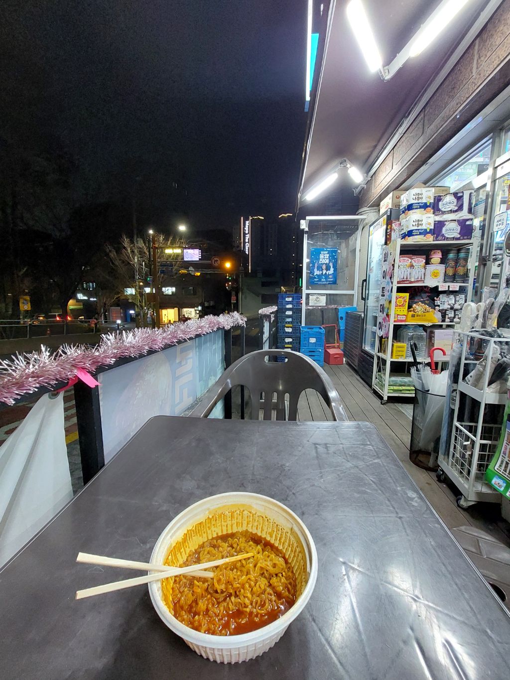 늦은밤 인적이 좀 드문 곳에서 바깥에 테이블 있는 편의점에서 먹어야하고