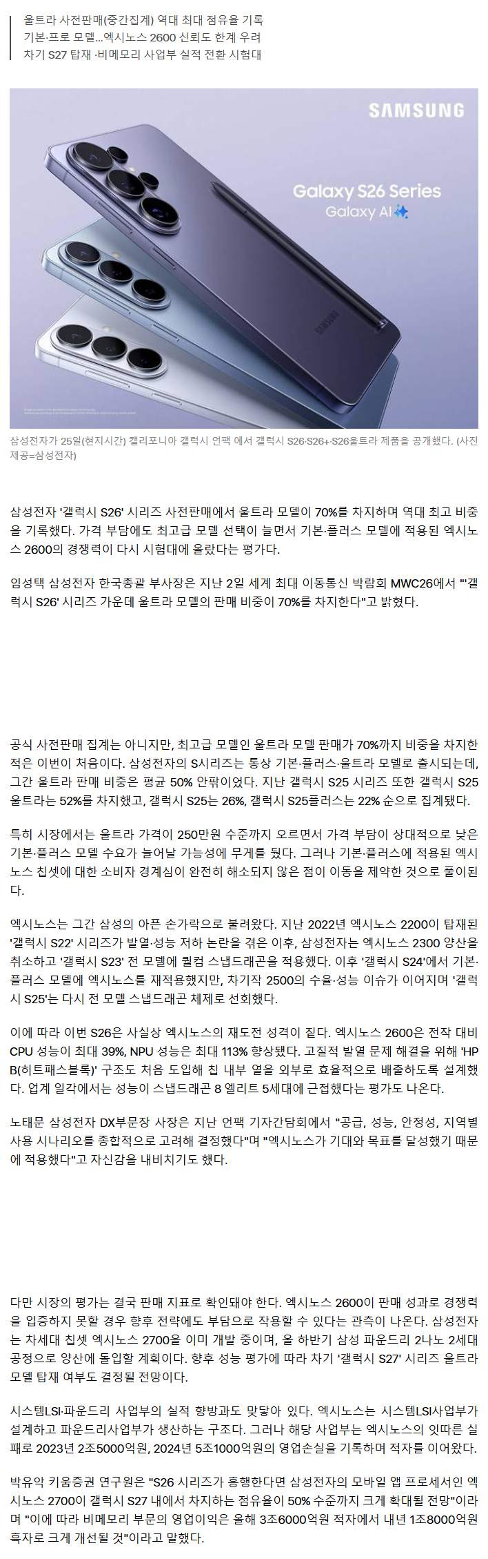 [기사]'울트라 쏠림' 더 심해질까?…엑시노스2600, 신뢰 회복 시험대 작성자김바덕|작성시간26.03.04|조회수2,259 목록 댓글 1 글자크기 작게가 글자크기 크게가 https://v.daum.net/v/20260304171405568'울트라 쏠림' 더 심해질까…엑시노스2600, 신뢰 회복 시험대삼성전자 '갤럭시 S26' 시리즈 사전판매에서 울트라 모델이 70%를 차지하며 역대 최고 비중을 기록했다. 가격 부담에도 최고급 모델 선택이 늘면서 기본·플러스 모델에 적용된 엑시노스 2600의 경v.daum.net 다음검색 현재 게시글 추가 기능 열기 북마크 공유하기 신고 센터로 신고 댓글 댓글 1 댓글쓰기 답글쓰기 댓글 리스트 작성자토로로쀼뀨 | 작성시간 26.03.04 걍 일반인이 쓰면 잘 모르는데 요즘 유투브에 하도 너도나도 전문가인척하는 영상이 많아서 기업들도 힘들긴하겟다 ㅋㅋㅋ 물론 원가절감이나 못속이는 긍정부분이 많으니 좋다만 . 애플한테도 좀 각잡고 후려주지... 15프로 진짜 아직도 욕나옴 댓글 전체보기
