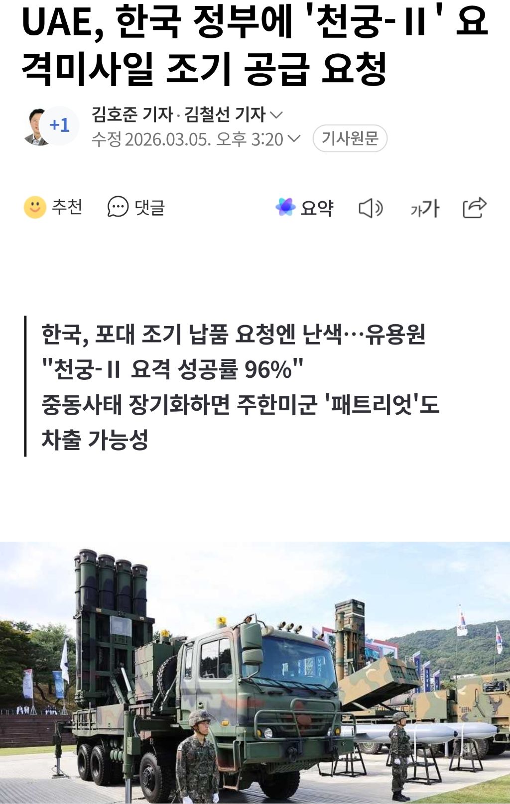 현재 UAE에 '천궁-Ⅱ' 2개 포대 실전배치중