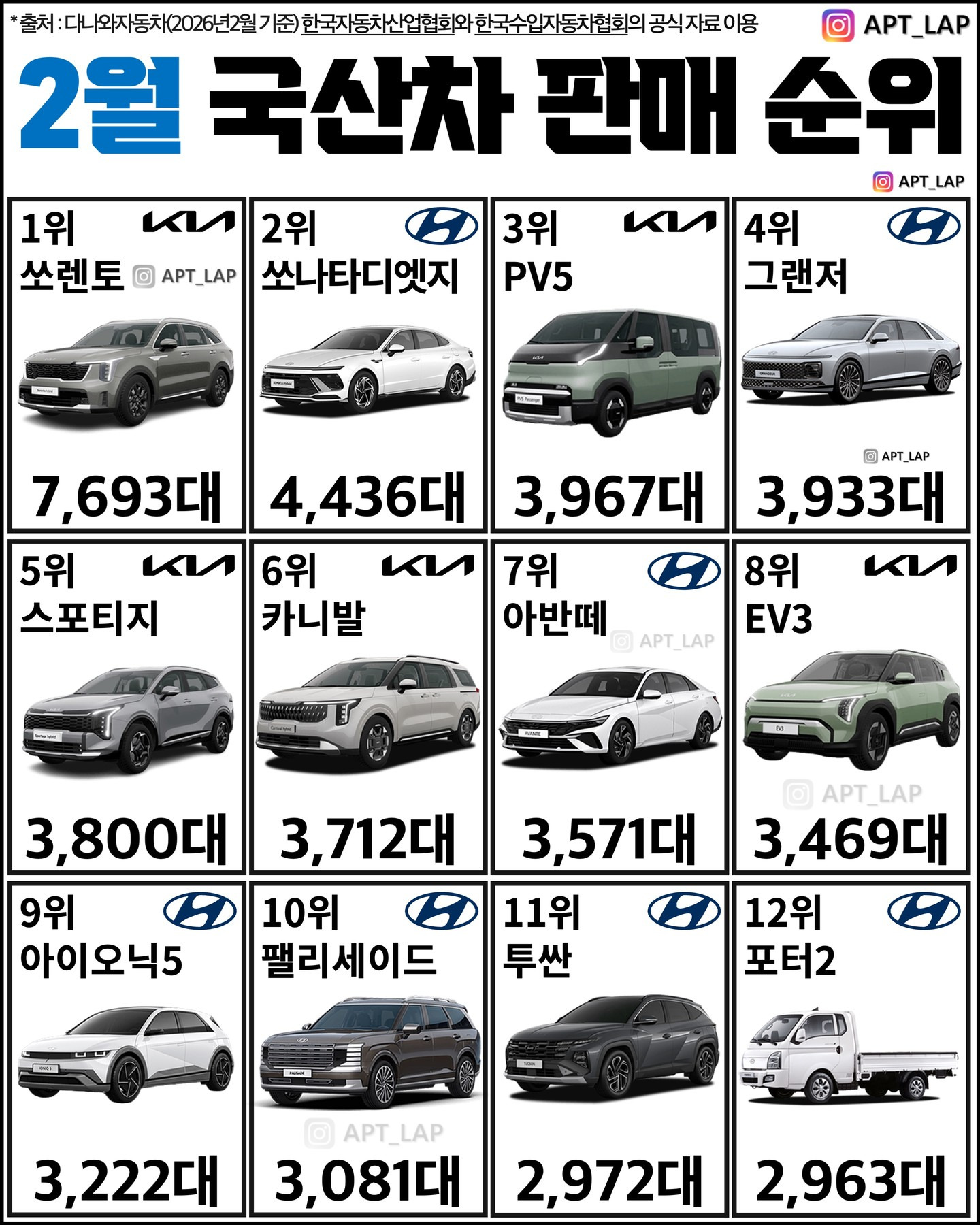 [자동차]2월 국산차, 수입차 판매순위.. 작성자rade bogdanovic|작성시간26.03.05|조회수3,974 목록 댓글 7 글자크기 작게가 글자크기 크게가 다음검색 현재 게시글 추가 기능 열기 북마크 공유하기 신고 센터로 신고 댓글 댓글 7 댓글쓰기 답글쓰기 댓글 리스트 작성자Starbucks | 작성시간 26.03.05 뭐 잘나가는 세단은 늘 잘 팔리네 작성자PinkMoon | 작성시간 26.03.05 모델y는 rwd가 듀얼모터 3배가 넘네 가성비 차긴 함 작성자프랭크 램파드 | 작성시간 26.03.05 pv5 새로나온건가 첨봄 ㄷㄷ 작성자시우아빠 | 작성시간 26.03.05 카니발이랑 스포티지 많이 떨어졌네 작성자편안밤 | 작성시간 26.03.06 G60 댓글 전체보기