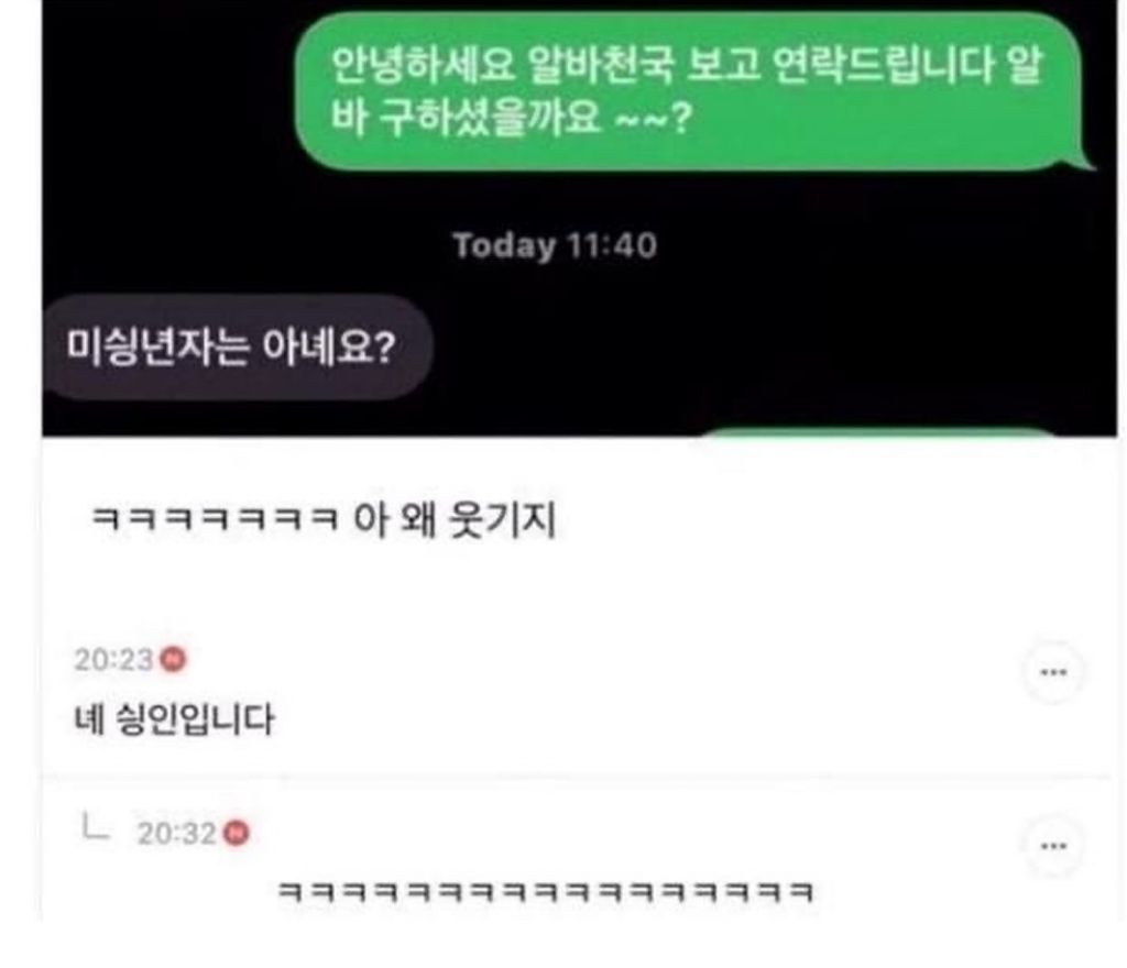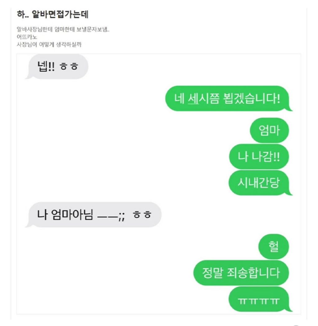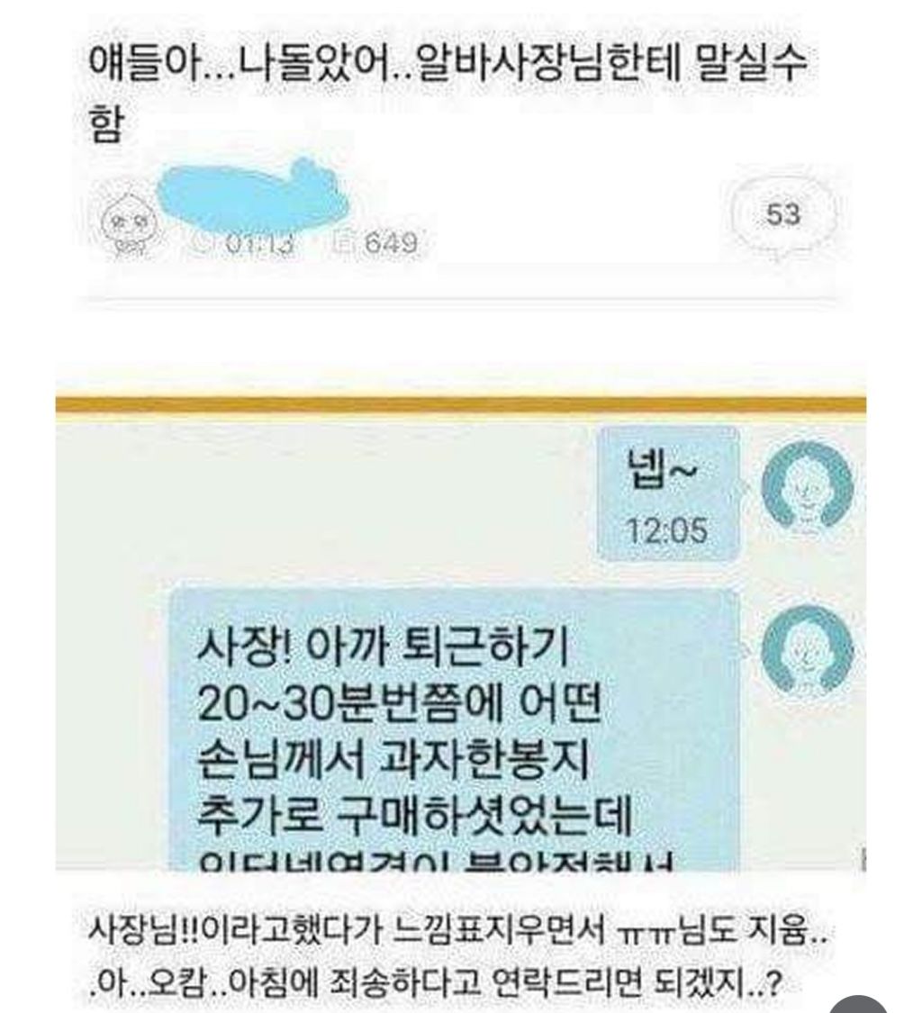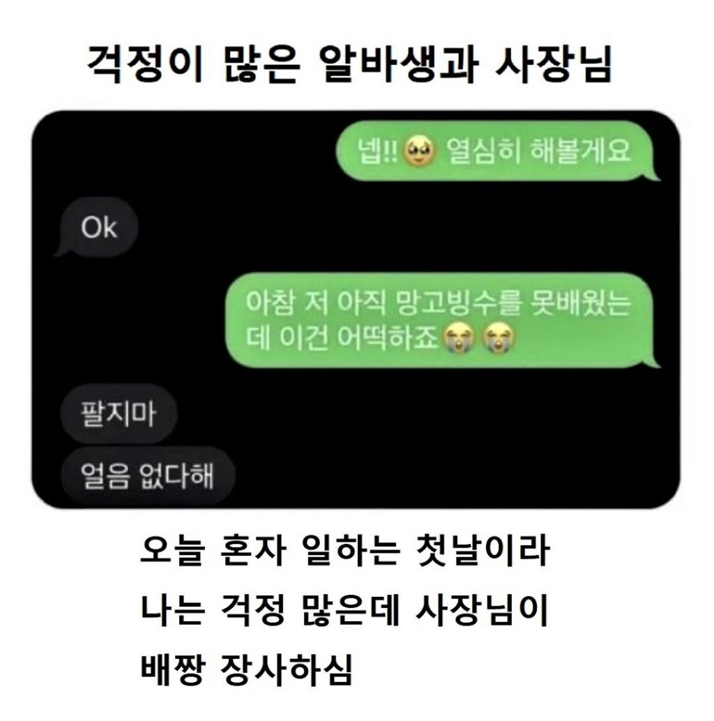 알바한지 한 달 째인데 사장님이랑 첫 카톡 작성자러바오|작성시간26.03.08|조회수20,874 목록 댓글 12 글자크기 작게가 글자크기 크게가 다음검색 현재 게시글 추가 기능 열기 북마크 공유하기 신고 센터로 신고 댓글 댓글 12 댓글쓰기 답글쓰기 댓글 리스트 작성자모과차 | 작성시간 26.03.08 그려 고마우이 ㅋㅋㅋㅋ 작성자JTBC | 작성시간 26.03.08 글쓴!! 작성자이천이십이 | 작성시간 26.03.08 재밌다ㅋㅋ 작성자유역비 | 작성시간 26.03.08 사장!! ㅋㅋㅋ다 재밌네요 ㅋㅋ 작성자대장황개 | 작성시간 26.03.08 사람몭ㅋㅈㅋㅈ 댓글 전체보기