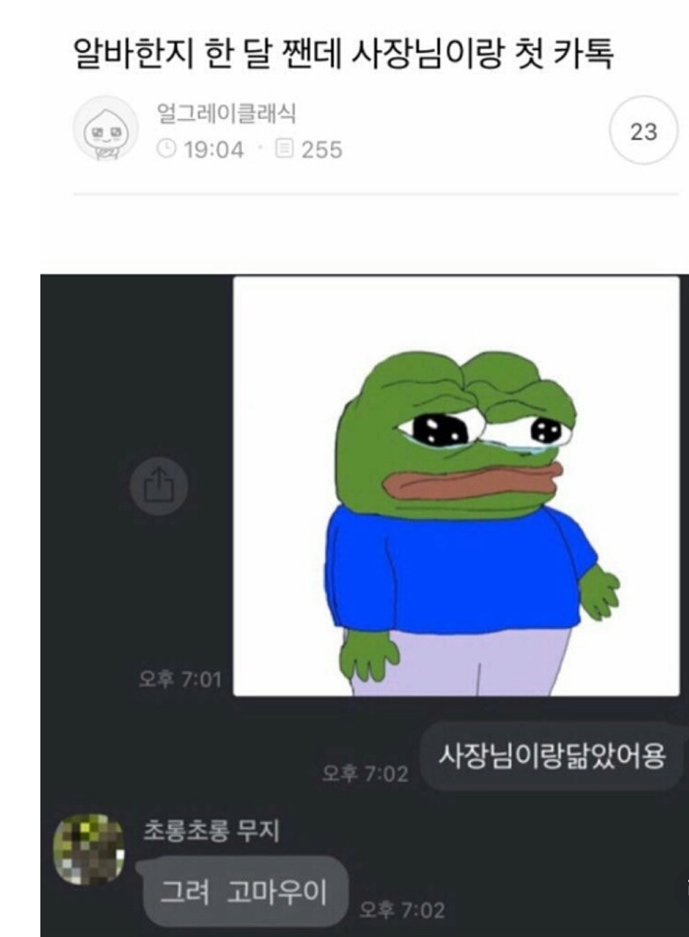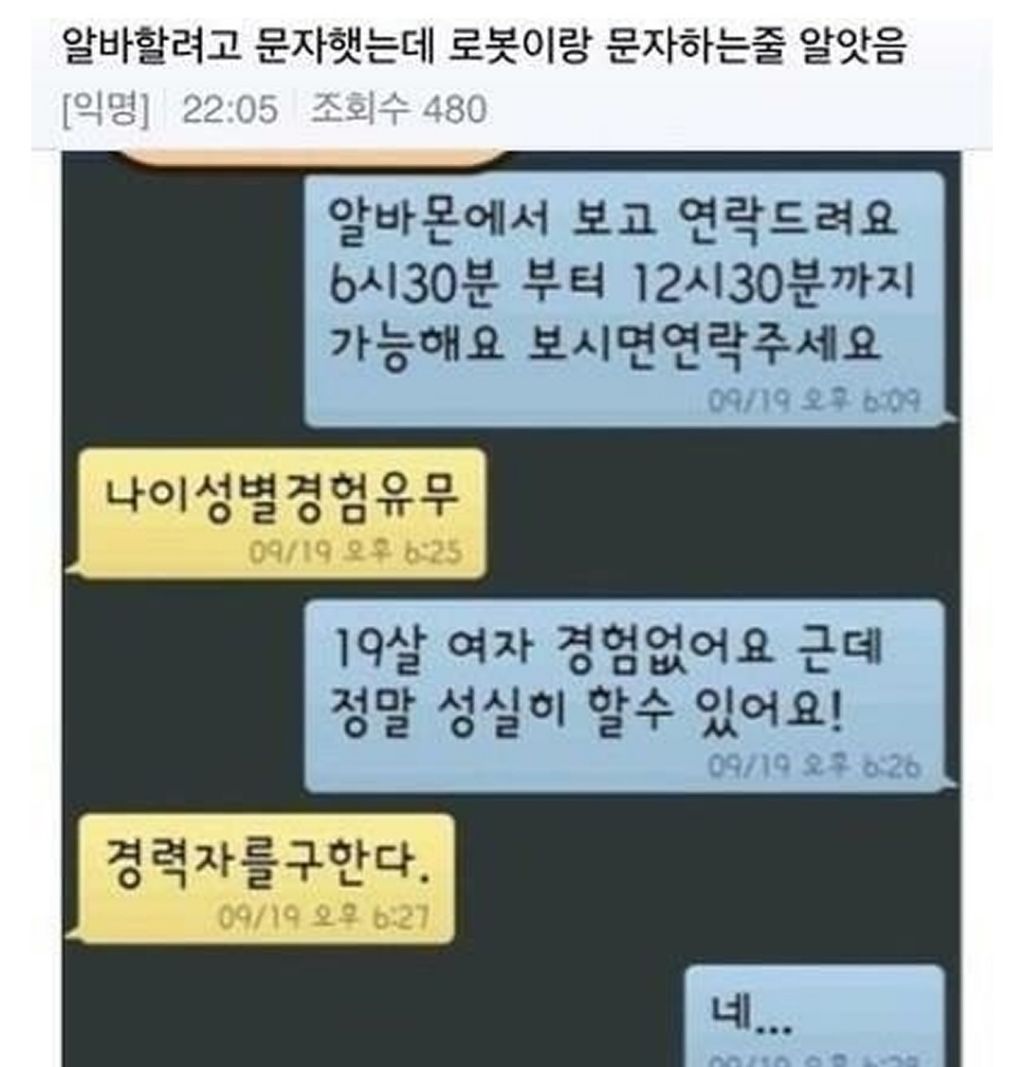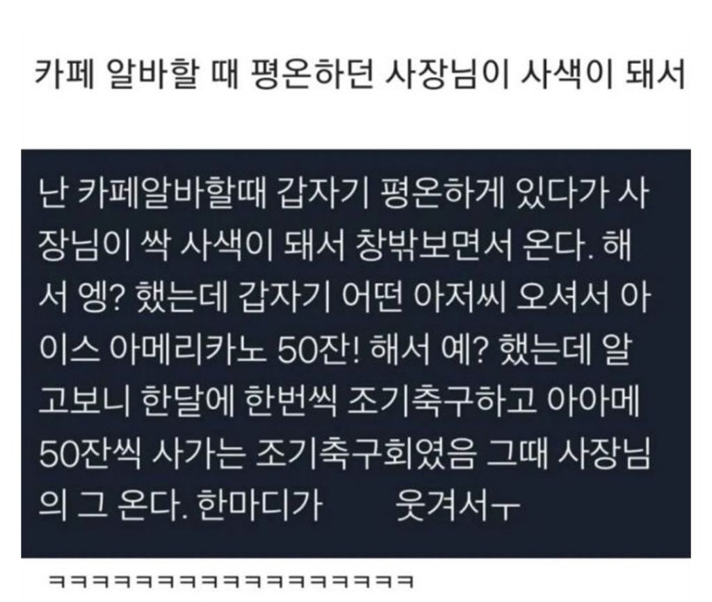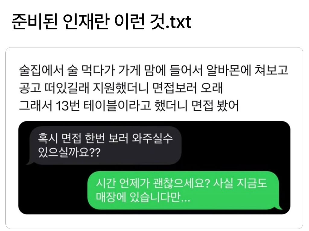 알바한지 한 달 째인데 사장님이랑 첫 카톡 작성자러바오|작성시간26.03.08|조회수20,874 목록 댓글 12 글자크기 작게가 글자크기 크게가 다음검색 현재 게시글 추가 기능 열기 북마크 공유하기 신고 센터로 신고 댓글 댓글 12 댓글쓰기 답글쓰기 댓글 리스트 작성자모과차 | 작성시간 26.03.08 그려 고마우이 ㅋㅋㅋㅋ 작성자JTBC | 작성시간 26.03.08 글쓴!! 작성자이천이십이 | 작성시간 26.03.08 재밌다ㅋㅋ 작성자유역비 | 작성시간 26.03.08 사장!! ㅋㅋㅋ다 재밌네요 ㅋㅋ 작성자대장황개 | 작성시간 26.03.08 사람몭ㅋㅈㅋㅈ 댓글 전체보기