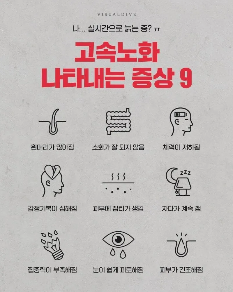 고속노화 나타내는 증상 9 작성자Mustard|작성시간26.03.08|조회수13,273 목록 댓글 8 글자크기 작게가 글자크기 크게가 다음검색 현재 게시글 추가 기능 열기 북마크 공유하기 신고 센터로 신고 댓글 댓글 8 댓글쓰기 답글쓰기 댓글 리스트 작성자Tensegrity Universe and Philosophy | 작성시간 26.03.08 + 노안, 새벽잠 없어짐, 작성자오스먼트 | 작성시간 26.03.08 흰머리, 눈의 피로,체력 저하 작성자정예린2 | 작성시간 26.03.08 ㅠㅠ 작성자M부에毛 | 작성시간 26.03.08 걍 나이든거 아님? 작성자I.B.I LUV | 작성시간 26.03.08 늙어간다 ㅠㅠ 댓글 전체보기