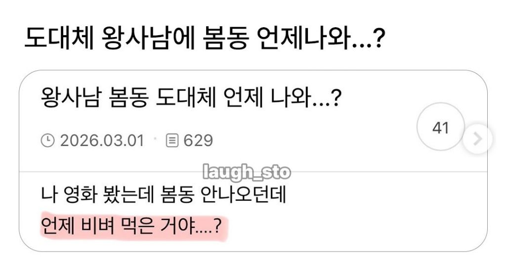 도대체 왕사남에 봄동 언제 나와...? 작성자러바오|작성시간26.03.12|조회수5,219 목록 댓글 7 글자크기 작게가 글자크기 크게가 https://www.instagram.com/p/DVsbEZ1AARg/ 다음검색 현재 게시글 추가 기능 열기 북마크 공유하기 신고 센터로 신고 댓글 댓글 7 댓글쓰기 답글쓰기 댓글 리스트 작성자포동이요 | 작성시간 26.03.12 ㅋㅋㅋㅋㅋㅋ 작성자Tensegrity Universe and Philosophy | 작성시간 26.03.12 이리저리 전파되다가.. 뭐? 왕사남에 엄복동이 나온다고? 작성자수박쥬스 | 작성시간 26.03.12 ㅋㅋㅋㅋㅋㅋ 작성자I’d rather be ashes than dust | 작성시간 26.03.12 ㅋㅋㅋ 작성자Gunners | 작성시간 26.03.12 봄동쿠키 ㅋㅋㅋㅋㅋㅋ 댓글 전체보기