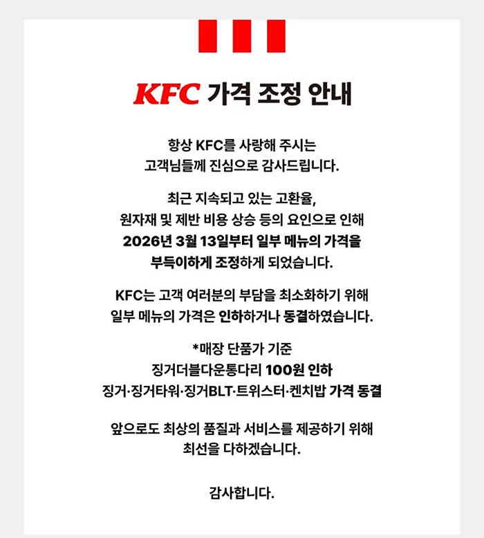 징거더블다운 통다리버거: 100원 인하